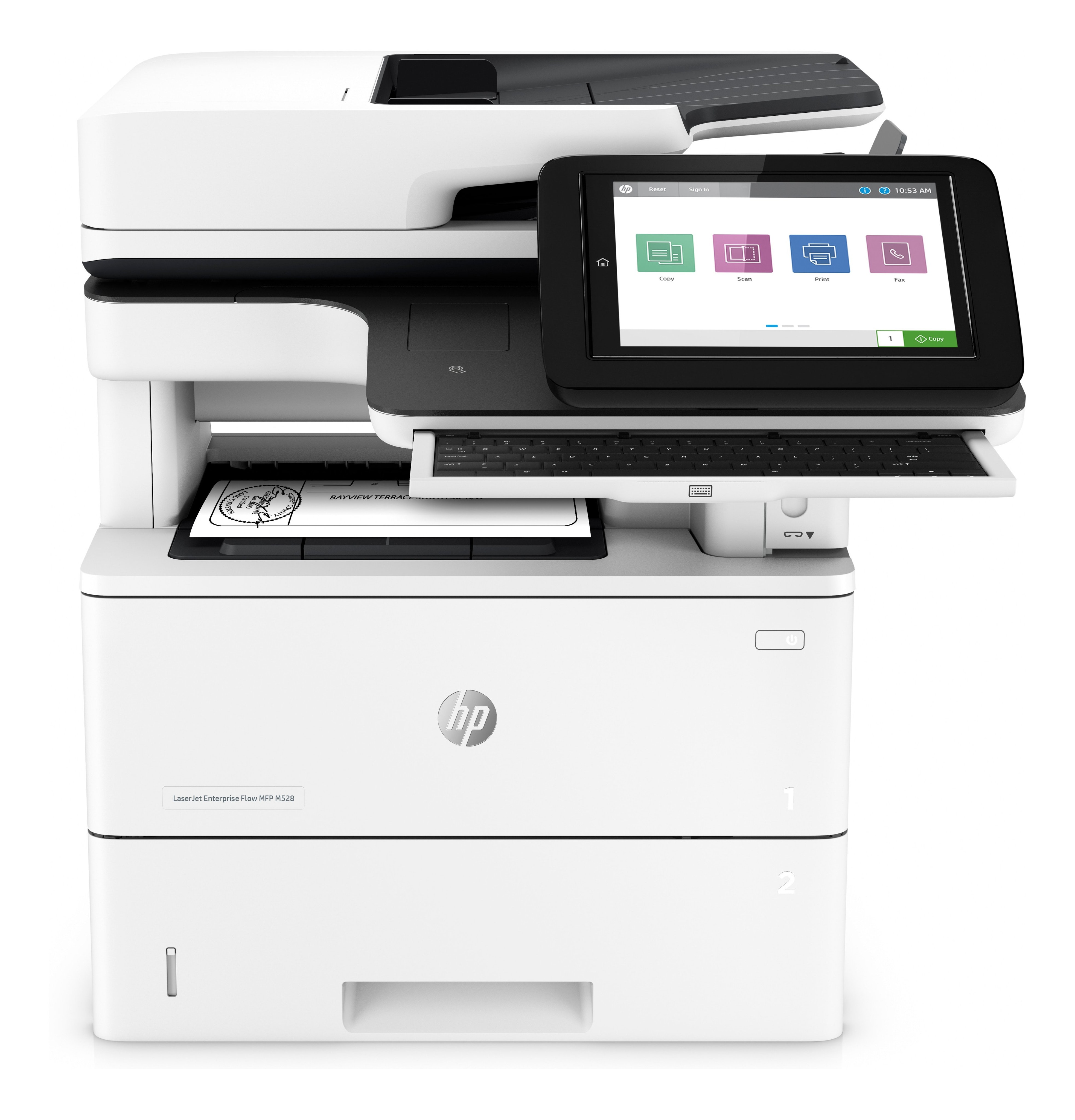 HP LaserJet Enterprise M528f. Tecnología de impresión: Laser, Impresión: Impresión en blanco y negro. Resolución máxima: 1200 x 1200 DPI. Copiando: Copias en blanco y negro. Resolución máxima de copia: 600 x 600 DPI. Resolución óptica de escáner: 600 x 600 DPI. Enviando por fax: Envío y recepción de faxes en blanco y negro, Funciones dúplex: Imprimir. Tamaño máximo de papel ISO A-series: A4. Capacidad de entrada estándar: 550 hojas, Capacidad de salida estándar: 250 hojas