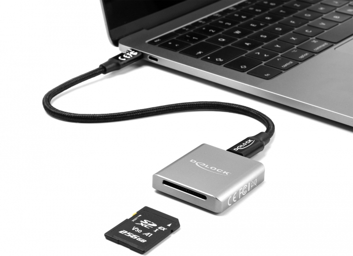 DeLOCK 91006. Tarjetas de memoria compatibles: SD, Color del producto: Gris, Velocidad de transferencia de datos: 10000 Mbit/s. Ancho: 41 mm, Profundidad: 45 mm, Altura: 9 mm. Cantidad por paquete: 1 pieza(s), Tipo de embalaje: Caja. Cables incluidos: USB tipo C a USB tipo C