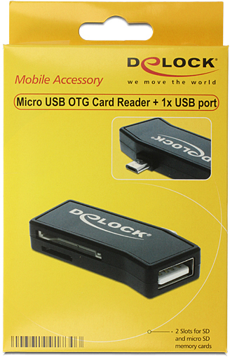 Este lector de tarjetas de Delock permite realizar operaciones de lectura y escritura en tarjetas de memoria a través del puerto OTG Micro USB de su teléfono inteligente o tableta. Además, proporciona un puerto hembra USB A mediante el que puede conectar unidades de disco duro, lápices de memoria, etc. con un puerto macho USB A a su teléfono móvil, teléfono inteligente o tableta compatible con OTG.