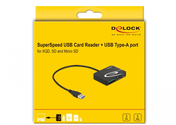 DeLOCK 91756. Tarjetas de memoria compatibles: MMC Mobile, MMCmicro, MicroSD (TransFlash), MicroSDHC, MicroSDXC, MiniSD, MiniSDHC, RS-MMC, SD,..., Color del producto: Negro, Velocidad de transferencia de datos: 5 Mbit/s. Ancho: 52 mm, Profundidad: 73 mm, Altura: 12 mm. Cantidad por paquete: 1 pieza(s), Tipo de embalaje: Caja