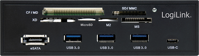 LogiLink UA0341. Tarjetas de memoria compatibles: CF, MS Micro (M2), Memoria extraíble, MicroSD (TransFlash), SD, xD, Color del producto: Negro, Bahías de unidad soportadas: 5.25"". Tipo de interfaz: SATA. Ancho: 148 mm, Profundidad: 78 mm, Altura: 42 mm. Cantidad por paquete: 1 pieza(s), Tipo de embalaje: Caja. Cables incluidos: USB