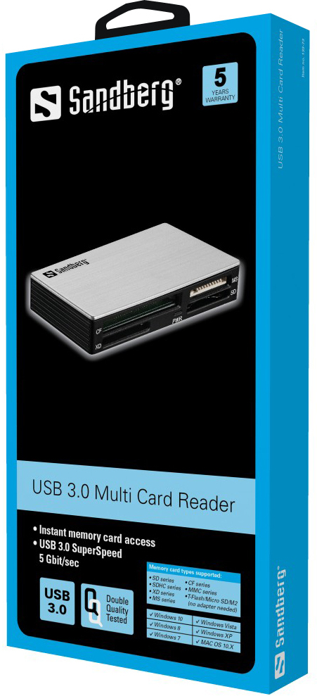 El Sandberg USB 3.0 Multi Card Reader es la elección perfecta si quieres leer y escribir en distintos tipos de tarjetas de memoria. Con el lector de tarjetas conectado al puerto USB, puedes leer y escribir en tu tarjeta de memoria exactamente como lo harías en un disco duro. Esto te permite, por ejemplo, ver las imágenes de tu cámara digital en cuestión de segundos.