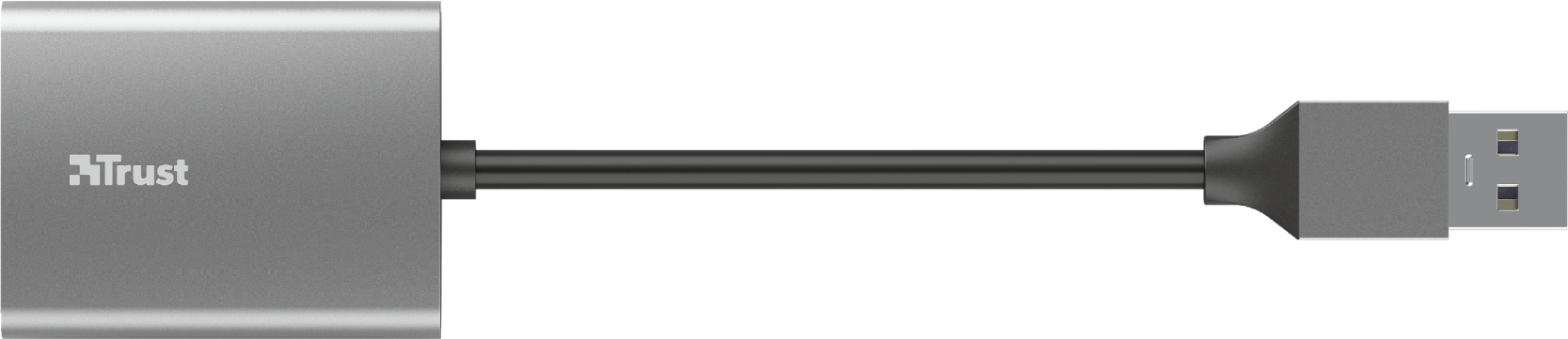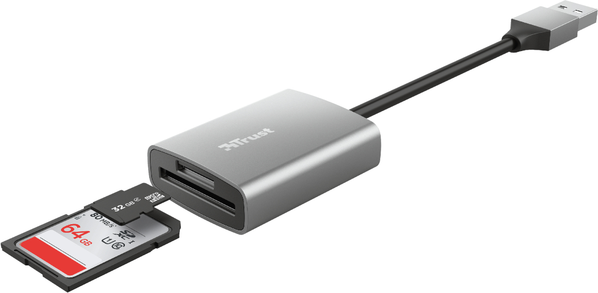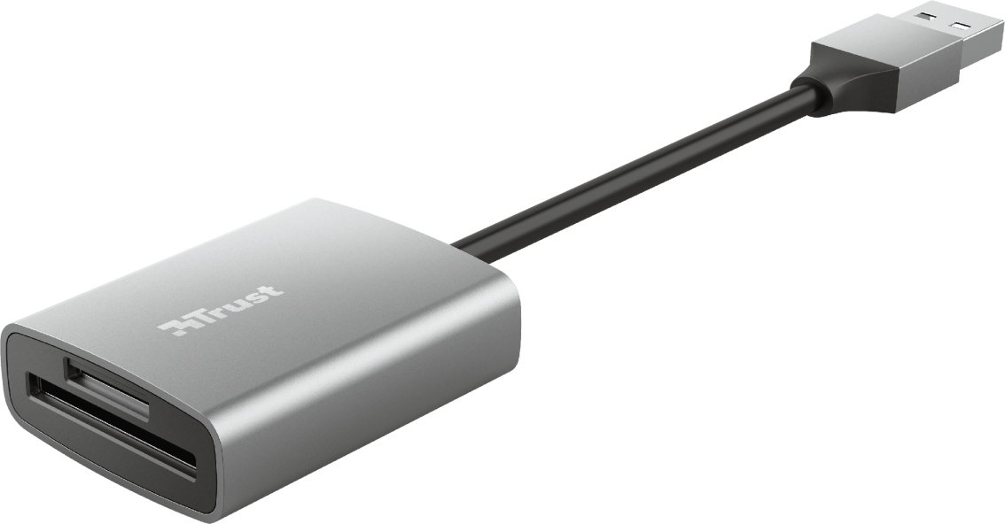 Trust Dalyx. Tarjetas de memoria compatibles: MicroSD (TransFlash), SD, SDHC, SDXC, Color del producto: Aluminio, Velocidad de transferencia de datos: 140 Mbit/s. Tipo de interfaz: USB 3.2 Gen 1 (3.1 Gen 1). Ancho: 34 mm, Profundidad: 14 mm, Altura: 44 mm. Cantidad por paquete: 1 pieza(s)