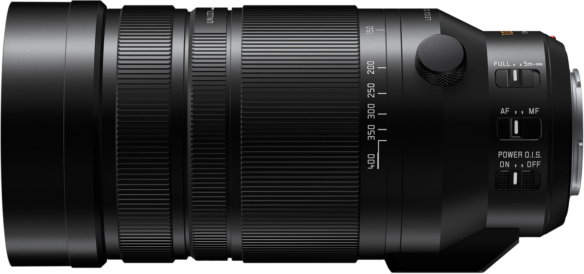 Panasonic Leica DG Vario-Elmar 100-400 mm / F4.0-6.3 II ASPH. / POWER O.I.S.. Componente para: MILC, Estructura de lente (elementos/grupos): 20/13, Tipo de lente: Ultra teleobjetivo zoom. Marcas de cámaras compatibles: Leica, Panasonic, Ampliación máxima: 0,5x, Características del revestimiento de la lente: Sistema nanorevestido (NCS). Color del producto: Negro. Diámetro: 8,3 cm, Tamaño de filtro: 7,2 cm, Longitud: 171,5 mm