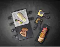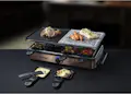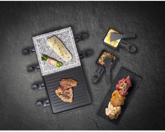 Por el placer de hacer una raclette para hasta 8 personas y disfrutarla en la mesa del comedor, en el balcón, la terraza o en el jardín. Placa de parrilla reversible con revestimiento antiadherente (21x21 cm) con superficie lisa y ranurada, placa de parrilla resistente a rasguños y cortes (21x21 cm) con ranura para jugo para obtener los mejores resultados sin agregar aceite. Tiempo de calentamiento rápido