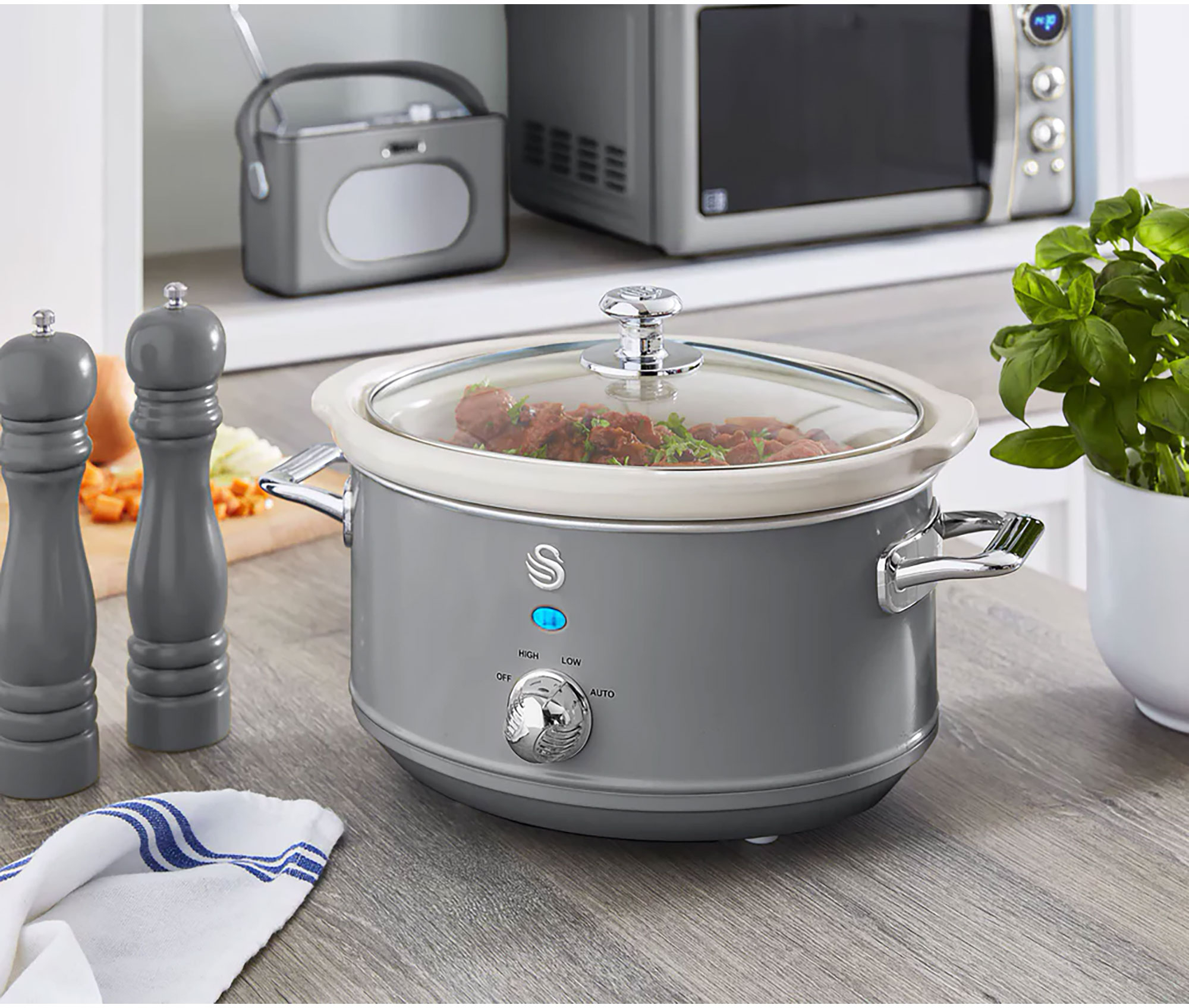 La olla de cocción lenta de Swan es la solución perfecta para los cocineros ocupados. Podrás cocinar los platos de toda la vida con todo su sabor y conservando más nutrientes y vitaminas gracias a su cocción a baja temperatura.CARACTERÍSTICAS:3 Temperaturas: Cocina gran variedad de platos utilizando sus 3 configuraciones de temperatura Alta / Baja / Automática según tus necesidades. Puedes cocinar a fuego lento con temperatura baja o cocinar en la mitad del tiempo con temperatura alta.Cerámica antiadherente: La olla interior está fabricada en cerámica antiadherente libre de PFOA y PTFE. Además es extraíble lo que permite servir la comida con comodidad, se puede lavar fácilmente y es apta para lavavajillas.Función ""Keep Warm"": Esta función evita que tus platos se enfríen manteniendo la comida a la temperatura perfecta para servir, ideal cuando los comensales se retrasan.3,5 Litros de capacidad: Tiene el tamaño perfecto para cocinar comidas familiares o simplemente para ti y tu pareja, ocupa muy poco espacio en tu cocina. Diseño Vintage: Su diseño retro y sencillo aporta elegancia a la vez que cumple su función de cocinar exquisitos platos. La gama Retro de Swan ofrece gran variedad de colores para que elijas el que mejor combina con la decoración de tu cocina.ESPECIFICACIONES:Olla de cocción lenta capacidad de 3,5 LitrosRecipiente interior de cerámica ExtraíbleTapa de vidrioAjustes de Temperatura LOW, HIGH y AUTOFunción Keep Warm (mantener caliente)Luz indicadora de encendidoFuncionamiento silenciosoDimensiones: Ancho 33,2 cm - Altura 22 cm - Profundidad 26,5 cmPotencia: 200WAlimentación: 220V-240V 50 / 60HzAjuste LOWLos ajustes de fuego bajo hierven suavemente los alimentos durante un largo período de tiempo sin que se cocinen en exceso o se quemen. No es necesario mover o revolver cuando se utiliza este ajuste. Ideal para platos de verdura y recalentamientoFunción Mantener calienteUna característica práctica que se utiliza para evitar que los alimentos se enfríen en caso de que sus comensales se retrasen. Mantener la comida a una temperatura perfecta para cuando esté listo para servir.Ajuste AUTOEn esta configuración, la cocción lenta se cocinará en la configuración Alta al principio y luego cambiará a la configuración Baja durante el resto del tiempo de cocción. Este es el ajuste más utilizado en cocinas de cocción lenta.Ajuste HIGHEl ajuste de calor alto se utiliza para hornear, cocinar frijoles secos o legumbres y cocinará los alimentos en la mitad del tiempo requerido para el ajuste de calor bajo, mover ocasionalmente los guisos y cazuelas mejorará la distribución del sabor.