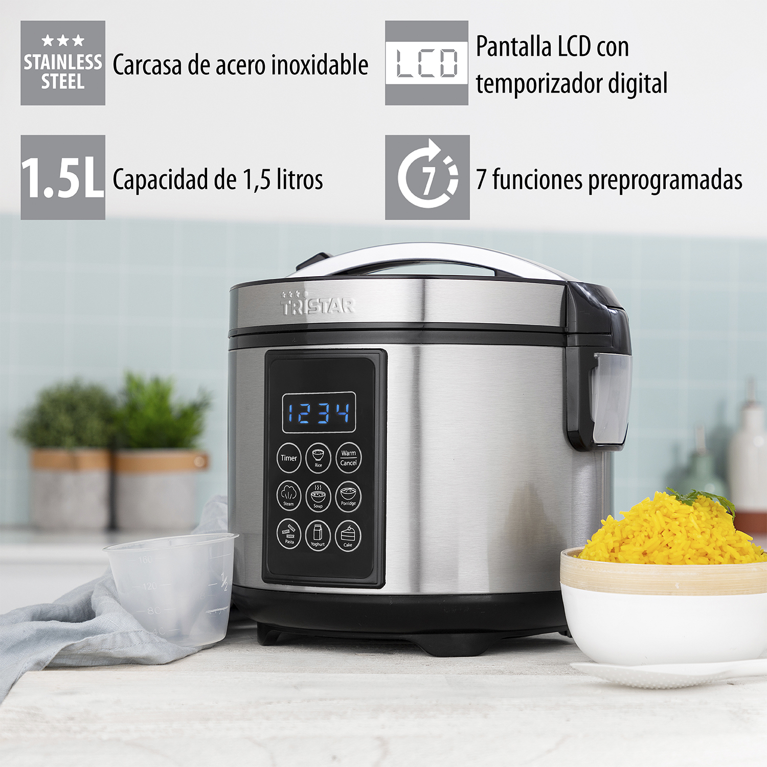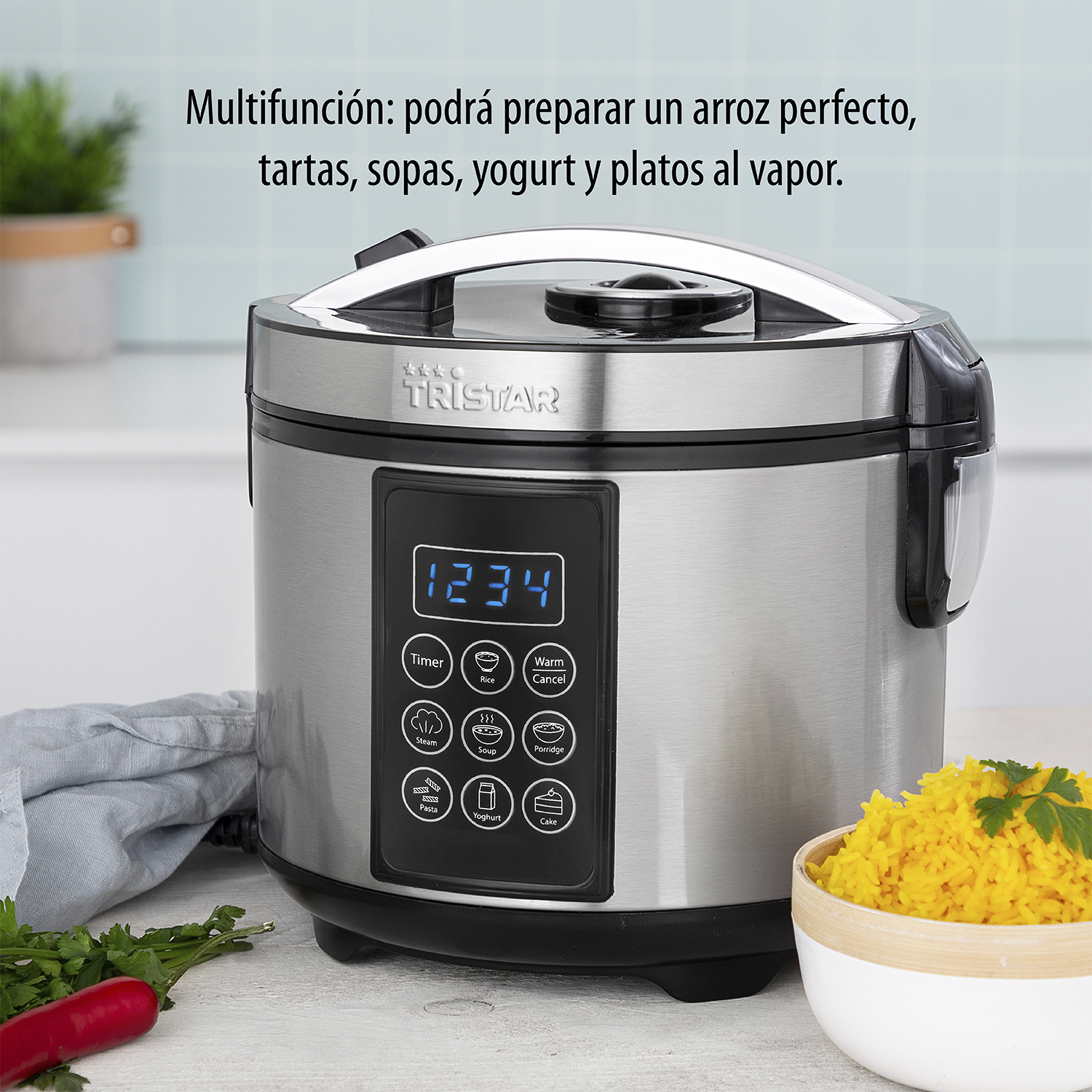 ¿En ocasiones tiene poco tiempo para poner sobre la mesa una comida saludable para su familia? Si es así, la Tristar RK-6132 es sin duda la solución que necesita. Gracias a esta arrocera y multicooker, el arroz siempre saldrá bueno y podrá cocinar de un modo versátil. Además de arroz, podrá preparar pasteles, sopa, yogurt, platos al vapor y otras comidas deliciosas. De este modo, preparará platos saludables para su familia sin preocuparse por ellos.\n\nBuenos resultados los días muy ajetreados\nLa arrocera y multicooker le ofrecerá muy buenos resultados los días más ajetreados. ¿Tiene que llevar a su hija al fútbol rápido y no le da tiempo a cocinar? Encienda la arrocera y multicooker antes de salir y deje que el plato se cocine solo. Cuando el arroz u el otro plato esté listo, el aparato se desconectará automáticamente. De este modo, la comida no se quema. Una vez apagado el multicooker, pasa automáticamente a la función para mantener el calor; de este modo, cuando llegue a casa, podrá disfrutar de una deliciosa comida sin más.\n\nDesde yogurt a platos al vapor\nAdemás de arrocera, es también multicooker. Esto significa que podrá preparar distintos platos con este electrodoméstico. Cueza, cocine al vapor, prepare arroz o sopa gracias a los 7 ajustes preprogramados: todo es posible. Encienda los programas simplemente pulsando un botón en la pantalla digital. Prepárese sus propias gachas o harina de avena por la mañana y utilice el aparato por la tarde para hacerse una deliciosa tortilla para comer. Le aconsejamos utilizar la arrocera y multicooker para preparar tartas de queso. Muy sabrosas y fáciles de preparar.\n\nGran capacidad\nLa arrocera y multicooker Tristar tiene una capacidad de 1,5 litros, por lo que podrá cocinar hasta 10 raciones de arroz a la vez. Pero también es posible cocinar cantidades más pequeñas de arroz. Por lo tanto, la arrocera y multicooker Tristar es ideal para las familias.\n\nDiseño elegante y práctico\nElegante recipiente gracias a la carcasa de acero inoxidable. En la pantalla digital, podrá ver si el recipiente está en uso o si está encendida la función para mantener el calor. La base antideslizante le da más estabilidad y la hace fácil de usar. Además, recibirá una cuchara, un medidor y una espátula con la arrocera y multicooker para que pueda medir con gran facilidad.\n\n¿Qué incluye la caja?\nArrocera y multicooker, cuchara, vaso medidor, espátula, manual