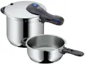 Set olla rápida Perfect con interiores de 8,5 L y cuerpo de 4.5 L. Acero inoxidable 18/10. Base de TransThermR adecuado para todas las fuentes de calor. Escala de medición interna. Mango de la tapa removible. Para cocinas inducción. Diametro de 22cm.