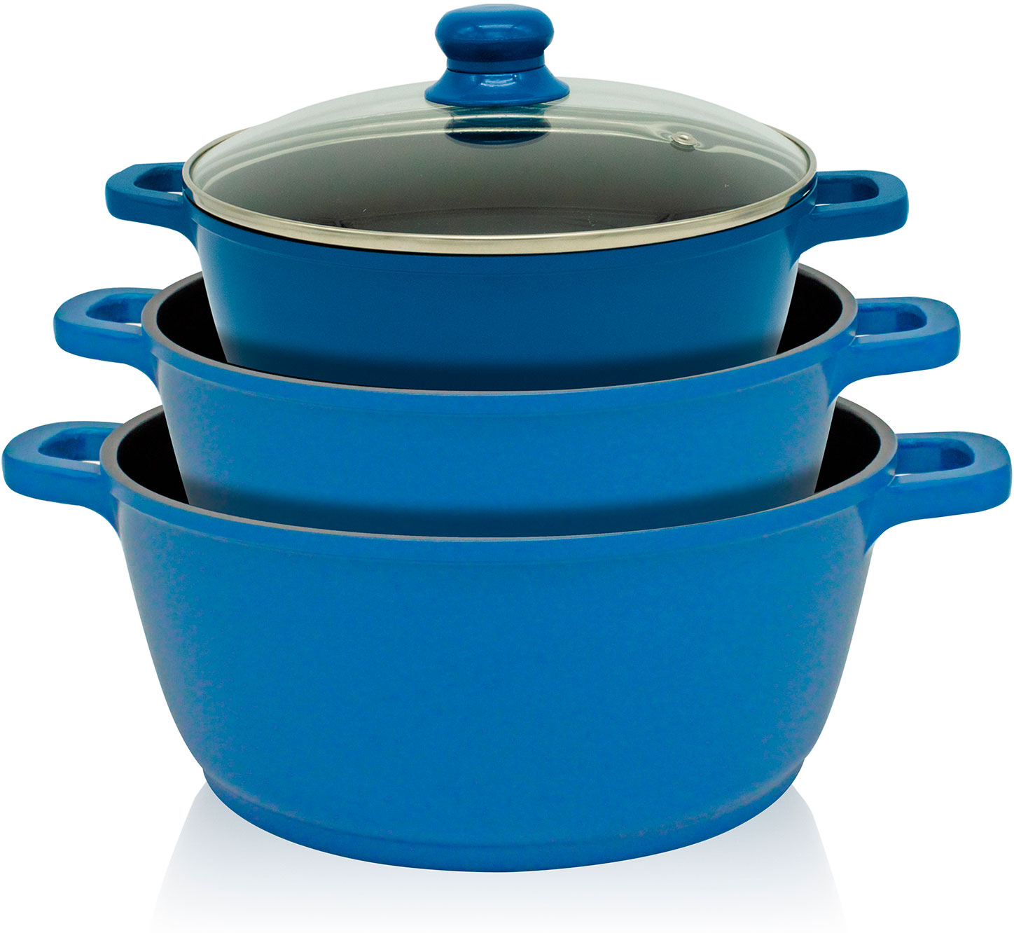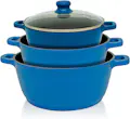 ?GRAN CALIDAD ALUMINIO FUNDIDO?Batería de Cocina inducción compuesta por Cazuelas con tapa de vidrio templado resistente a golpes y válvula para la salida de vapor, fabricada en aluminio fundido indeformable con un gran acabado.?ANTIADHERENTE DAIKIN?Recubrimiento antiadherente de alta calidad Japonés Daikin Industries. Ideal para cocinar recetas sin grasas, ya que cocina con muy poco aceite conservando todos los nutrientes?INDUCCIÓN?Todas las piezas de la batería tienen un acabado grueso y fondo difusor especial de Inducción que proporciona una transmisión del calor perfecta y homogénea en toda la superficie para ahorrar energía. Fáciles de mantener aptas para limpieza en lavavajillas.?APTA TODO TIPO DE COCINAS?El Set de ollas son Aptas para todo tipo de cocinas, vitrocerámicas, gas, eléctrica, inducción. Cazo y sartenes con mango de baquelita soft touch muy ergonómico. Tapas de vidrio templado con válvula para la salida de vapor y pomo.?7 PIEZAS - TAPAS VIDRIO TEMPLADO?Batería cocina compuesta por Cacerola de 16cm con Tapa | Cacerola de 20cm con Tapa | Cacerola de 24cm con Tapa | Cazo de 18cm | Sartén 18cm | Sartén 20cm | Sartén 24cm.