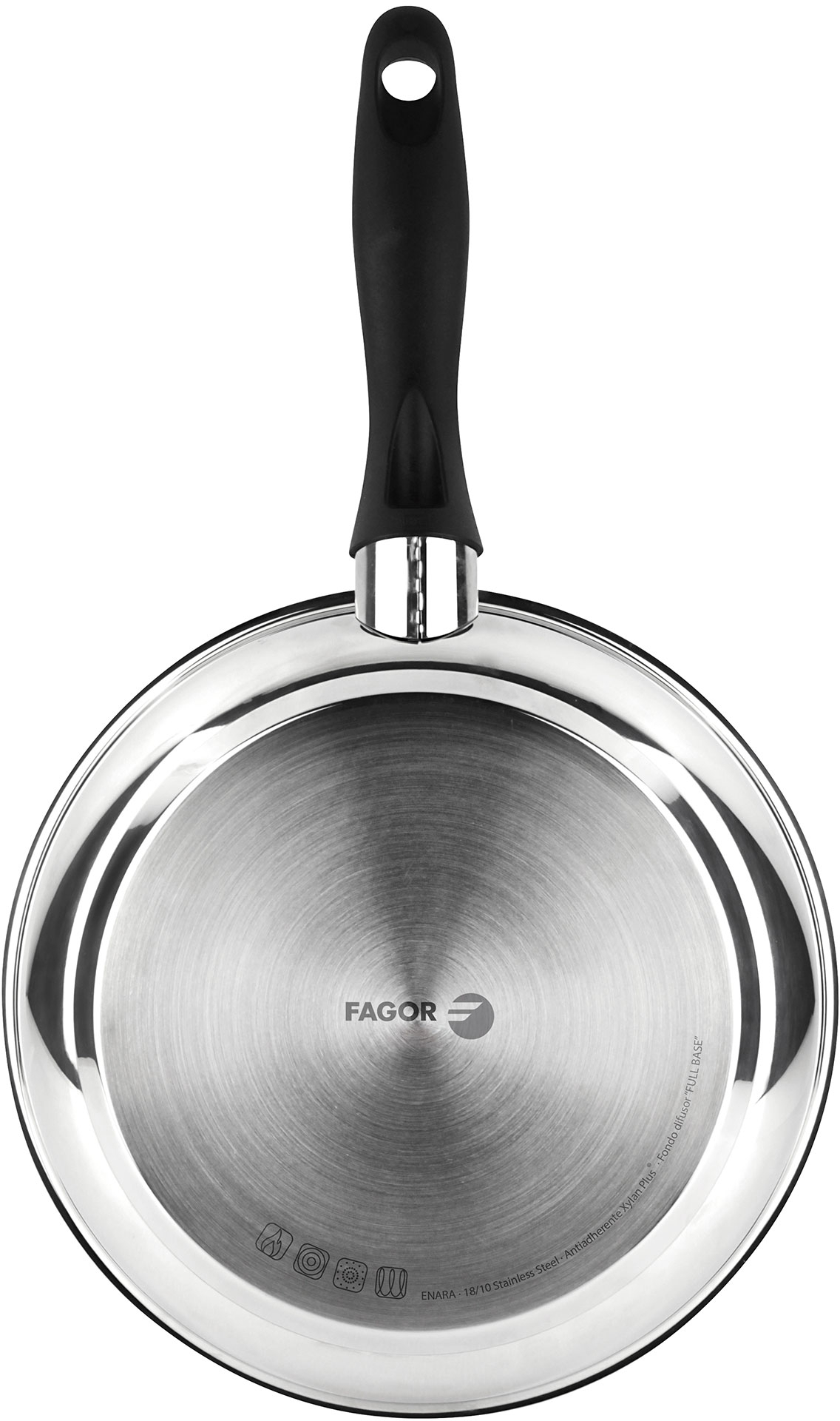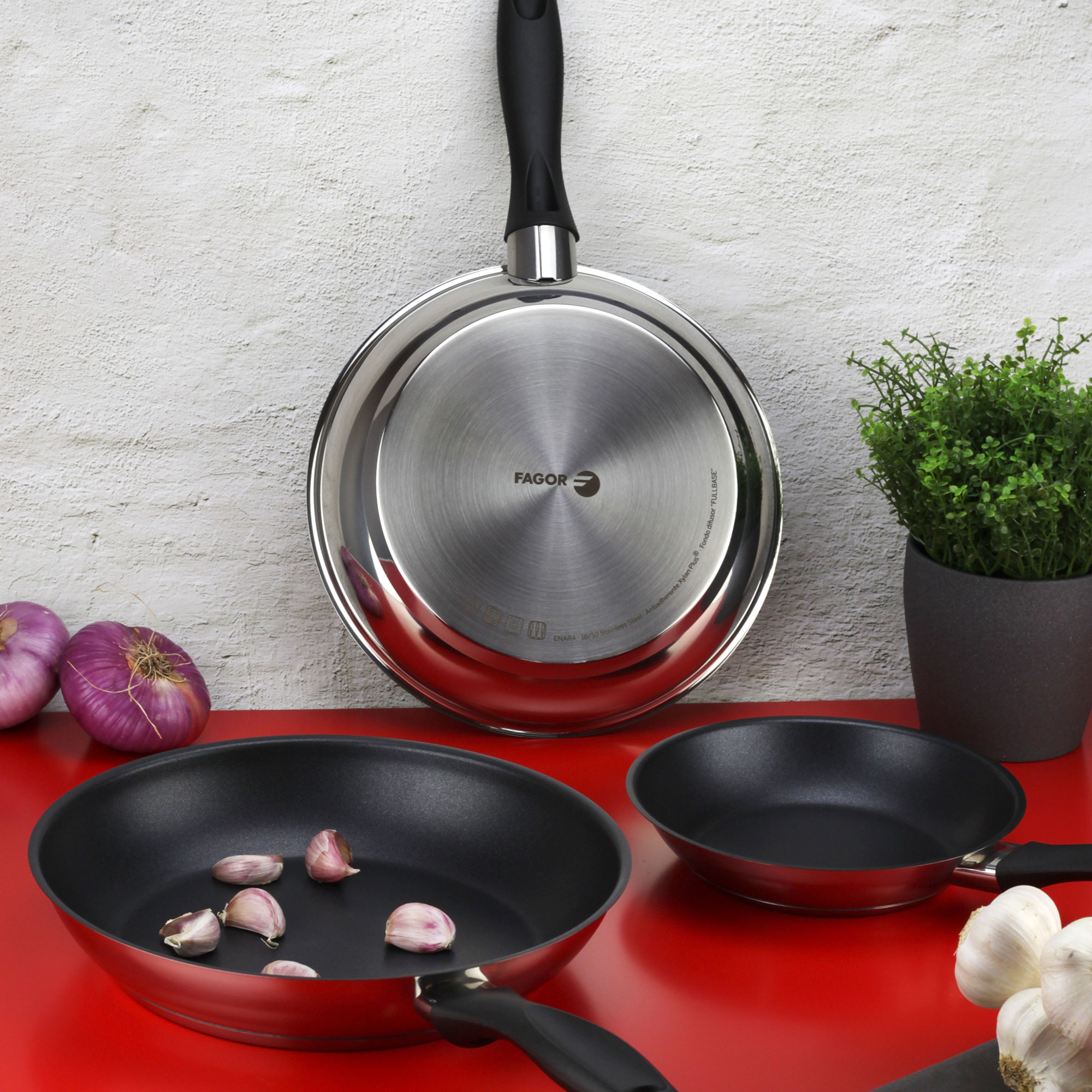 Las sartenes Fagor Enara no solo te ayudan a cocinar tus alimentos, también reducen el tiempo de cocinado conservando la calidad de los alimentos y ahorrando energía.CARACTERÍSTICAS:Acero Inoxidable: Sartenes fabricadas en acero inoxidable 18/10 de alta calidad que garantiza, resistencia al uso y distribución del calor eficiente. Acabado exterior en acero pulido espejo.Antiadherente doble capa: El antiadherente XYLAN PLUS de doble capa libre de PFOA, plomo y cadmio, que impide que los alimentos se peguen a la pieza y facilita la limpieza.Inducción: El fondo difusor de triple capa (acero + aluminio + acero) que mejora la conductibilidad térmica proporciona una distribución del calor rápida y homogénea, lo que implica un menor gasto de energía para cocinar los alimentos.Apta todo tipo de cocinas: Permite cocinar con muy poca cantidad de aceite y son aptas para todo tipo de cocinas: Vitrocerámica, Gas, Eléctrica, Inducción. Se limpian fácilmente y son aptas para limpieza en lavavajillas.Mango de Baquelita: Su mango de baquelita es ergonómico de tacto suave y frío por lo que ofrecen un agarre cómodo y mantienen tus manos a salvo de las quemaduras.3 Piezas: El lote incluye 3 sartenes: Ø 18 / Ø 20 cm / Ø 24 cm.ESPECIFICACIONES:Acero Inoxidable 18/10.Antiadherente de doble capa Xylan Plus.Fondo difusor de 3 capas (acero + aluminio + acero).Acabado exterior pulido espejo.Mango ergonómico de baquelita termoaislante.Libre de cadmio y PFOA. Sin metales pesados.Fácil limpieza.Fabricado en España.