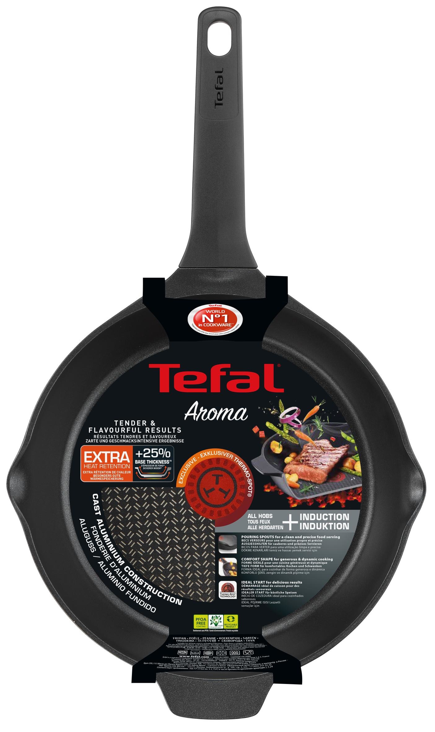 Tefal E21504, Aroma. Forma: Alrededor, Tipo: Sartén multiuso, Color del producto: Negro. Diámetro: 24 cm, Peso: 1,07 kg, Ancho del paquete: 268 mm. Cantidad por contenedor (20ft): 3786 pieza(s), Cantidad por contenedor (40ft): 7770 pieza(s), Cantidad por contenedor intermodal (40ft, HC): 9102 pieza(s)