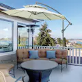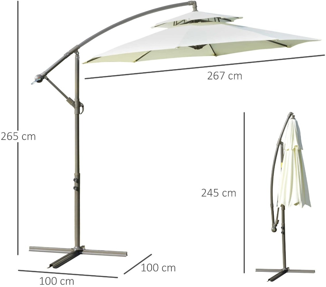 Esta elegante sombrilla de jardín de Outsunny es un accesorio imprescindible para el verano. Su diseño con poste excéntrico te ofrece un espacio sombrado que no se ve condicionado como pasa en ocasiones con las sombrillas con poste central, protegiendo del sol incluso mesas grandes, sofás, conjuntos y más. Con estructura robusta de metal con 8 varillas que sujetan firmemente el toldo, proporciona mucha sombra, refresca los calurosos días de verano y también crea un ambiente agradable. Características - Sombrilla de exterior con poste lateral para proporcionar una zona sombreada sin obstáculos de por medio - El ángulo de la capota se puede ajustar fácilmente con el mango - Poste de metal para una estructura resistente, conectado al toldo mediante 8 varillas - Sombrilla con apertura y cierre fácil mediante manivela - El techo doble permite que el aire fluya en días ventosos para mayor seguridad y ofrece una buena ventilación para menor sensación de calor - Base cruzada incluida para mayor estabilidad, se requieren pesos (no incluidos) - Se requiere montaje Especificaciones - Color: beige - Material: poliéster y acero - Medidas totales: Ø267x265 cm (DxAL) - Medidas del mástil: Ø48 mm - Referencia: 84D-187BG - NOTA 1: Se incluye una base cruzada, pero se requieren pesos adicionales (no incluidos) - NOTA 2: No se recomienda su uso bajo lluvia intensa u otras condiciones adversas