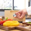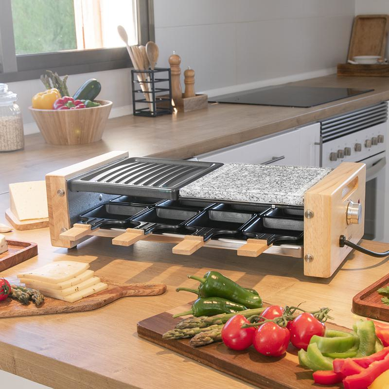 Máquina de Raclette para 8 personas con grill de 1200W. Con estructura de madera,\ntermostato regulable y 2 placas de asar antiadherentes; una con superficie de grill de\nacero con revestimiento de alta calidad y la otra superficie de plancha de piedra natural.\nIncluye 8 sartenes pequeñas antiadherentes.