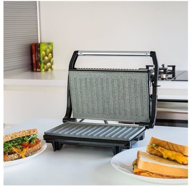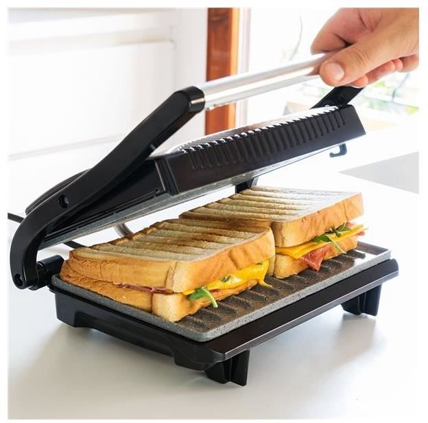 Panini Grill, Parrilla Eléctrica, Plancha y Sandwichera con revestimiento RockStone. 700W y superficie de 23x14,5 cm. Con clip de cierre y caja de cables hueca. Rock´nGrill 700 de Cecotec
