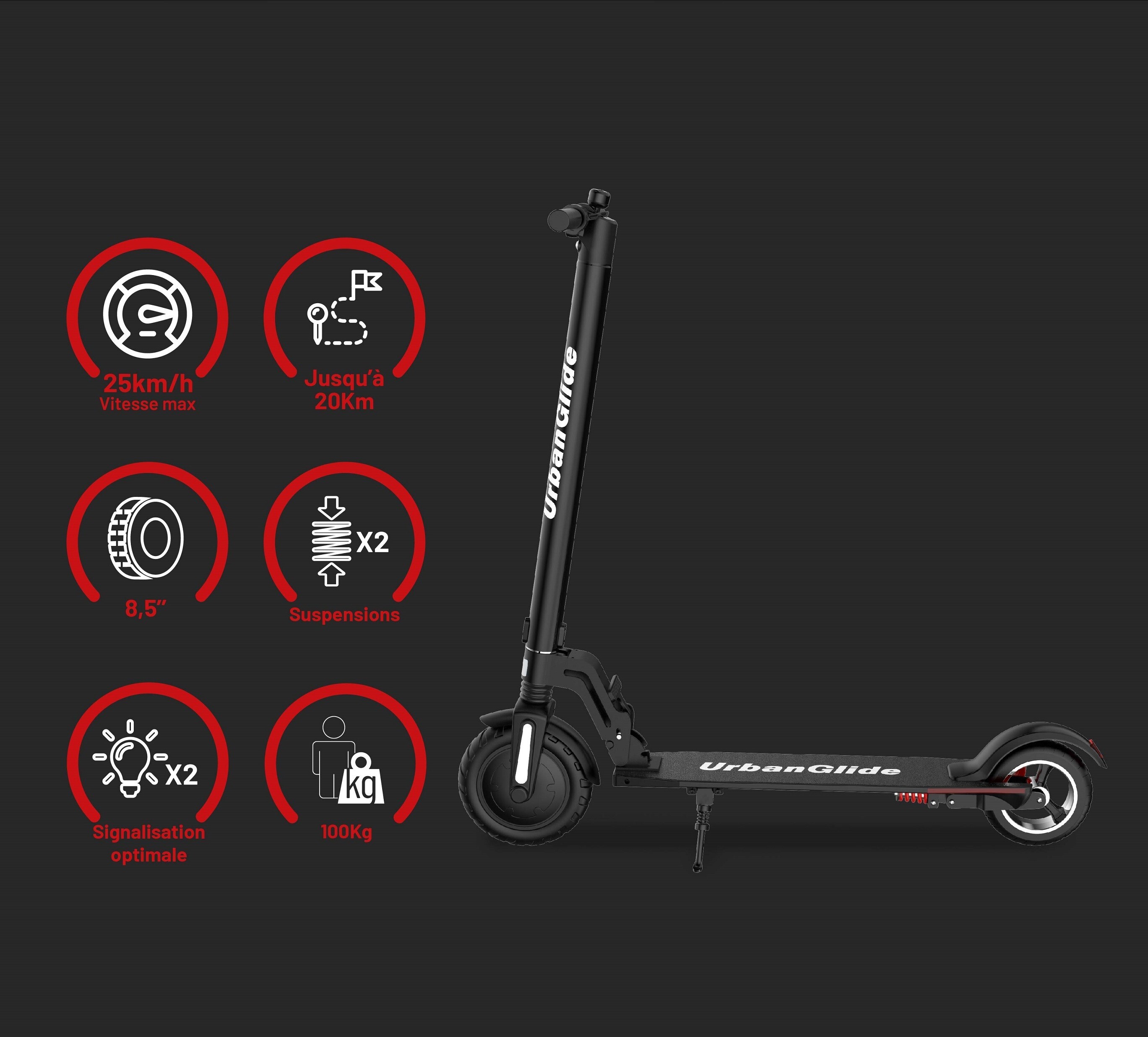 El patinete electrico 85S tiene un alcance de 20km para una velocidad maxima de 25 km / h. Sus ruedas de 8.5"" ""te permiten un mejor agarre al suelo. Su señalizacion optima (luz delantera y trasera) te permite conducir con total seguridad. Ride 85S es ideal para el transporte diario. Caracteristicas tecnicas:.Velocidad maxima: 25 km / h.Tamaño de la rueda: 8.5 ''.Peso del producto: 12,9 kg.Distancia maxima: 20 km.Potencia maxima: 350 W.Peso del usuario: maximo 100 kg.Tiempo de carga: 4 h.Bateria: 6 Ah