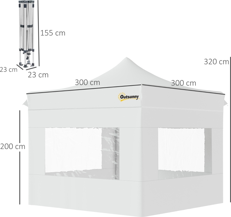 ¿Estás planeando una actividad o evento al aire libre? Una gazebo plegable es imprescindible en todas las épocas del año. En verano para protegerse del sol, en otoño o invierno del frío y en cualquier estación del viento y la lluvia. Además, esta carpa portátil de Outsunny se puede ajustar en altura, y cuando no vayas a usarla, simplemente puede plegarla y guardarla en la bolsa de transporte incluida. Y como tiene ruedas, será fácil de transportar de un lugar a otro. Características - Esta carpa de camping de 3x3m ofrece suficiente espacio para diversas actividades al aire libre - Ideal para eventos al aire libre como bodas, fiestas de cumpleaños, eventos de empresa y otros - Estructura de metal con recubrimiento en polvo para mayor resistencia a la intemperie y a la corrosión - Toldo y paredes de tela Oxford resistente a los rayos UV - Su altura se puede ajustar en 3 posiciones en intervalos de 8,5 cm - Con paredes laterales desmontables para quitar o instalar según tus necesidades - Cuenta con una puerta con cremallera para facilitar el acceso y ventanas para una mejor iluminación y visibilidad - Incluye 4 cuerdas de tracción y 8 estacas de suelo para fijar en el suelo para mayor estabilidad - Requiere montaje - Nota: No usar con viento o lluvia intensa Especificaciones - Color: blanco - Material: tela Oxford y metal - Medidas totales: 300x300x320 cm (LxANxAL) - Altura del alero: 200 cm - Medidas estando plegada: 23x23x155 cm (LxANxAL) - Medidas de las ventanas: 198x96 cm (LxAL) - Medidas de las paredes laterales: 298x220 cm (LxAL) - Referencia: 84C-279