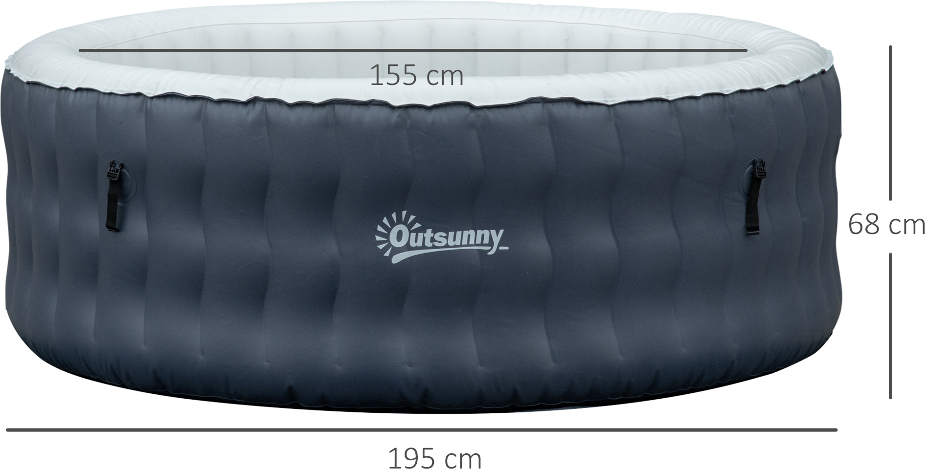 Lleva el SPA a tu hogar con esta piscina de hidromasaje hinchable de Outsunny. Con 108 chorros de aire y función de calefacción, podrás tener un rincón de relajación para toda la familia en tu jardín. La piscina elevada, de hecho, se infla fácilmente presionando únicamente un botón y puede acomodar hasta 4-6 personas. Además, está equipada con una cubierta y filtro de agua para filtrar las impurezas. Características - Para 4-6 personas - Hidromasaje con 108 chorros de aire - Fácil de inflar presionando un solo botón - La temperatura máxima del agua es de 42 ?, a razón de 1-2 ? por hora - 8 botones: calefacción, hidromasaje, filtrado y aumento y disminución de temperatura - Viene con una cubierta para tapar y proteger el agua cuando no está en uso - No usar ni dejarlo afuera cuando la temperatura exterior sea inferior a 4 ? - Cartucho de filtro incluido Especificaciones - Color: azul oscuro y blanco - Material: PVC, ABS - Medidas totales: Ø195x68 cm (DxAL) - Medidas interiores: Ø155x67 cm (DxAL) - Capacidad: 950L - Tasa de calentamiento: aumento de temperatura de 1-2 ? por hora - Temperatura máxima de calentamiento: 42 ? - Voltaje nominal: 220-240 V, 50HZ - Potencia nominal: 1540 W (1500 W (calentador), 650 W (hidromasaje), 40 W (filtro) - Corriente nominal: 6A - Corriente máxima: 16A - Duración de cada filtro: 60 horas - Medidas de la caja de control: 20x33x36 cm (LxANxAL) - Certificaciones: EMC, LVD, ERP y ROHS - Referencia: 848-046V92NU