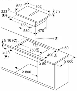 Balay 3EBC989LU. Color del producto: Negro, Tipo de instalación: Integrado, Anchura de los quemadores: 80 cm. Tipo de control: Tocar, Control de posición: Parte superior delantera. Tipo de extracción: Canalizado/Recirculación, Máxima capacidad de extracción: 622 m³/h, Nivel de ruido: 69 dB. Carga conectada (eléctrica): 7400 W, Escala de eficiencia energética: A+++ a D, Voltaje de entrada AC: 220-240/380-415 V. Ancho: 802 mm, Profundidad: 522 mm, Altura: 223 mm