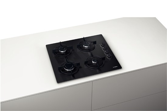 Bosch POP6B6B10. Color del producto: Negro, Diseño: Integrado, Tipo de quemador: Encimera de gas. Tipo de control: Giratorio, Control de posición: Arriba a la derecha. Carga conectada (eléctrica): 1 W, Carga conectada (gas): 7400 W, Voltaje de entrada AC: 220 - 240 V. Ancho: 590 mm, Profundidad: 520 mm, Altura: 45 mm