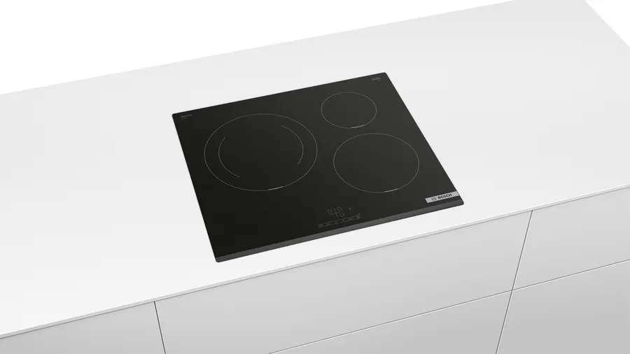 Bosch Serie 4 PIJ631BB5E. Color del producto: Negro, Tipo de instalación: Integrado, Anchura de los quemadores: 59.2 cm. Tipo de control: Tocar, Control de posición: Parte superior delantera, La duración del temporizador: 20 min. Carga conectada (eléctrica): 7400 W, Voltaje de entrada AC: 220 - 240 V, Frecuencia de entrada AC: 50/60 Hz. Ancho: 592 mm, Profundidad: 522 mm, Altura: 51 mm