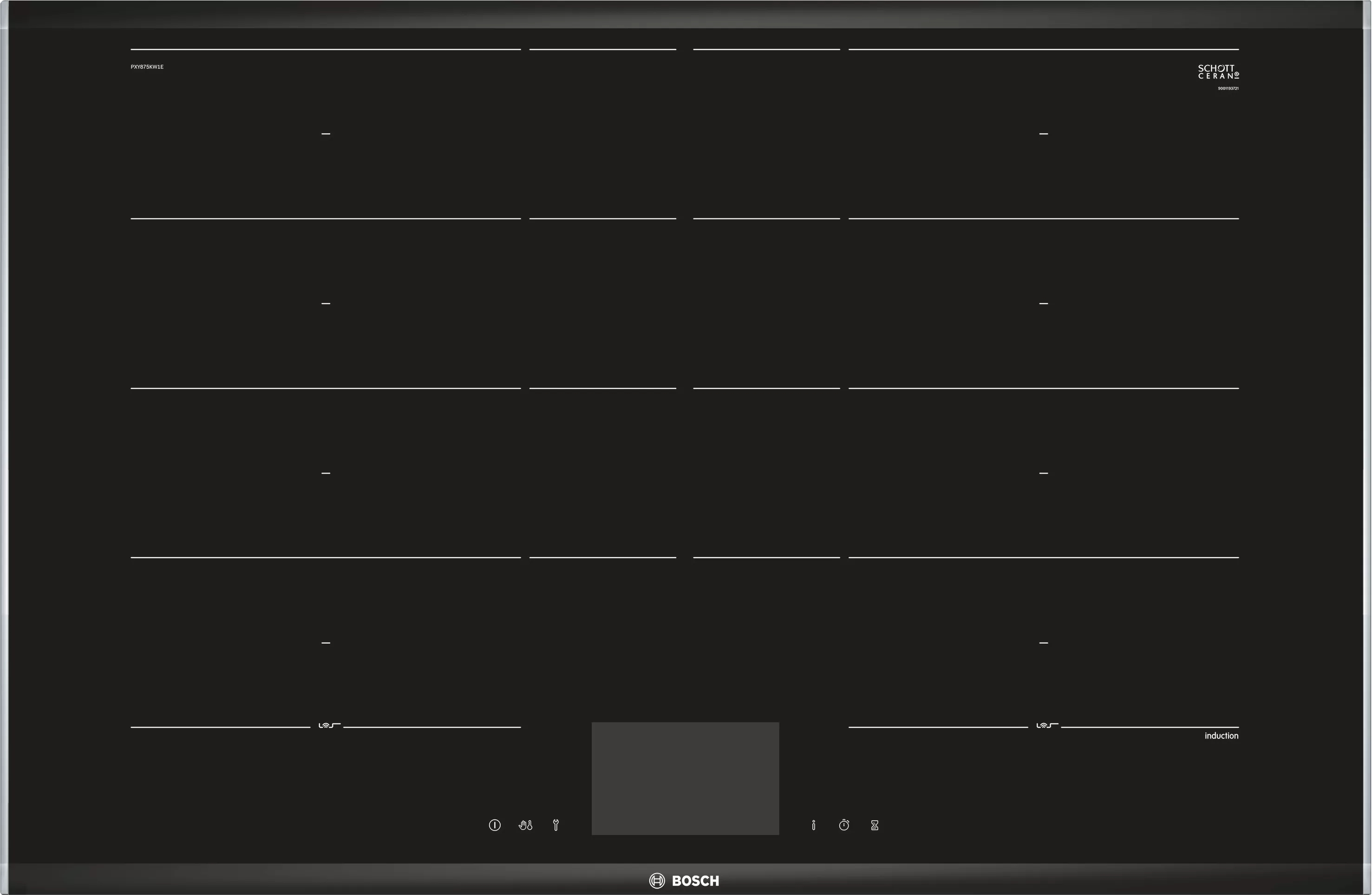 Bosch Serie 8 PXY875KV1E. Color del producto: Negro, Tipo de instalación: Integrado, Anchura de los quemadores: 80 cm. Tipo de control: Tocar, Control de posición: Frente, Tipo de visualizador: TFT. Carga conectada (eléctrica): 7400 W, Voltaje de entrada AC: 220 - 240 V, Frecuencia de entrada AC: 50 - 60 Hz. Ancho: 816 mm, Profundidad: 527 mm, Altura: 51 mm