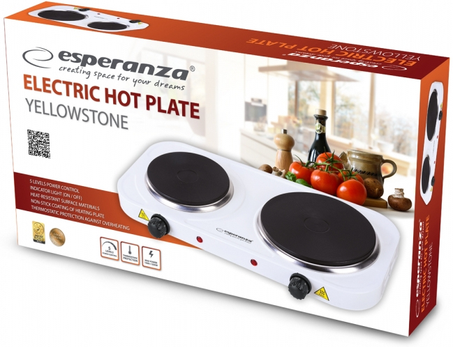 Esperanza EKH007W. Color del producto: Blanco, Tipo de instalación: Encimera, Tipo de quemador: Hornillo eléctrico / Placa eléctrica. Zona de cocción a fuego lento: 1000 W, Zona de cocción media: 1500 W. Tipo de control: Giratorio, Control de posición: Frente. Carga conectada (eléctrica): 2500 W, Voltaje de entrada AC: 220 - 230 V, Frecuencia de entrada AC: 50 - 60 Hz. Ancho: 480 mm, Profundidad: 235 mm, Altura: 70 mm