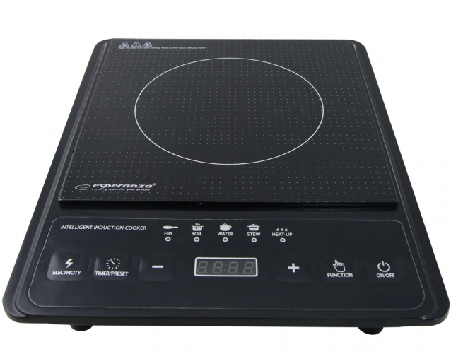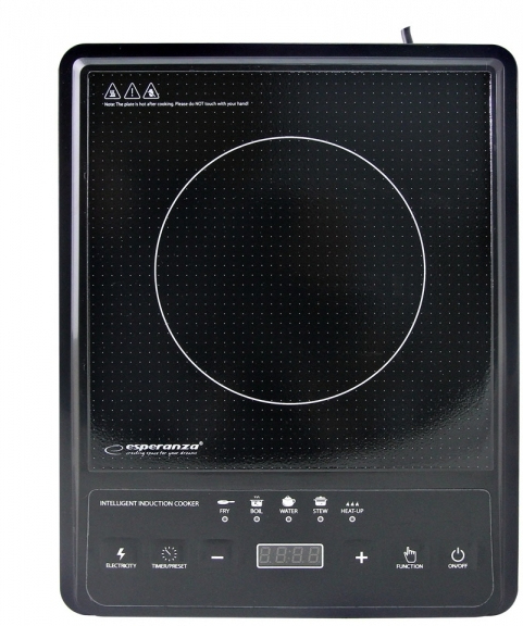Esperanza EKH011. Color del producto: Negro, Tipo de instalación: Encimera, Tipo de quemador: Con placa de inducción. Rango de temperatura (T-T): 80 - 270 °C, Diámetros de sarten compatibles: 140 - 220 mm. Tipo de control: Tocar, Control de posición: Parte superior delantera, Tipo de temporizador: Digital. Carga conectada (eléctrica): 2000 W, Voltaje de entrada AC: 230 V, Frecuencia de entrada AC: 50 Hz. Ancho: 280 mm, Profundidad: 360 mm, Altura: 70 mm