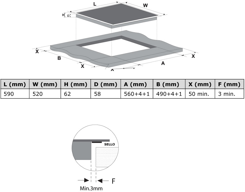 CARACTERÍSTICAS GENERALES:Modo de calentamiento:InducciónTipo de control:TouchNúmero de zonas:3Programador (min):1 a 99Niveles de potencias:9Boost:NoBloqueo para niños:SíIndicador de calor residual:SíDetección automática de recipiente:SíTamaño zona frontal izquierda (mm):160Potencia zona frontal izquierda (W):1300/1500Tamaño zona trasera izquieda (mm):210Potencia zona trasera izquieda (W):2300/2600Tamaño zona media derecha (mm):290Potencia zona media derecha (W):2600/3000Potencia (V):220-240Frecuencia (Hz):50/60Potencia eléctrica instalada (W):6600Certificación:CE,GS,ROHS,REACHDimensiones del producto (Ancho x Fondo x alto) (mm):590x520x51Dimensiones de instalación (Ancho x Fondo) :560 x 490Dimensiones del embalaje (Ancho x Fondo x alto) (mm):690x645x115Peso neto (kg):8,71Peso bruto (Kg):10,1