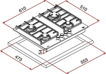 - Placa de cocción a gas butano/propano (OPCION natural: REF: 40216200 );\n- Acabado sin marco exterior;\n- Mandos frontales incorporados;\n- Superficie de vidrio templado;\n- Seguridad por termopar integrada en quemador individual;\n- Autoencendido integrado en quemador y accionado por cada mando;\n- Quemadores de gas: Un quemador auxiliar, 1,00 kW; un quemador rápido, 2,80 kW, y un quemador triple anillo, 4,00 kW;\n- Parrillas de fundición.