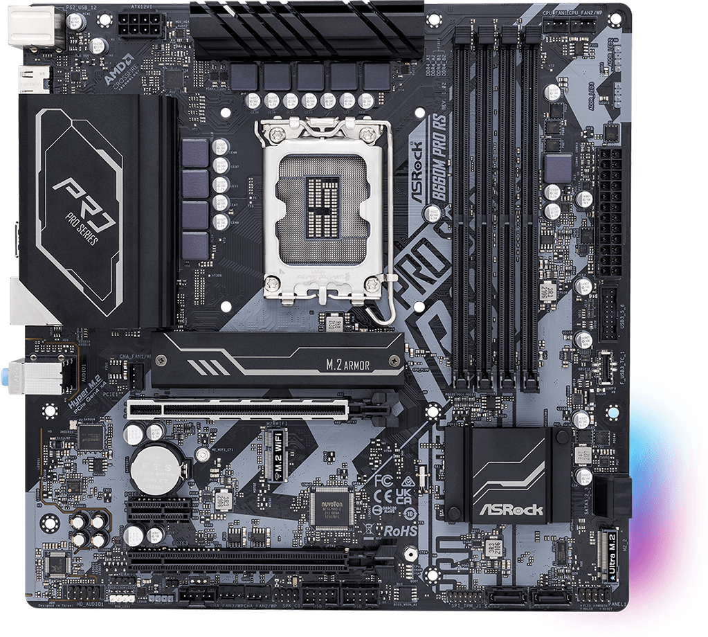Asrock B660M Pro RS. Fabricante de procesador: Intel, Socket de procesador: LGA 1700, Procesador compatible: Intel® Celeron®, Intel® Core™ i3, Intel Core i5, Intel Core i7, Intel Core i9, Intel® Pentium®. tipos de memoria compatibles: DDR4-SDRAM, Memoria interna máxima: 128 GB, Tipo de ranuras de memoria: DIMM. Interfaces de disco de almacenamiento soportados: M.2,SATA III, Tipos de unidades de almacenamiento admitidas: HDD & SSD. Soporte para proceso paralelo: Crossfire, Máxima resolución: 7680 x 4320 Pixeles. Tipo de interfaz ethernet: Gigabit Ethernet, Controlador LAN: Intel® I219-V.Sistema operativo Windows soportado: Windows 10 x64,Windows 11 x64,Monitoreo de la salud de PC: CPU, Ventilador, Temperatura, Tensión,Canales de salida de audio: 7.1 canales,Tipos de unidades de almacenamiento admitidas: HDD & SSD,Interfaces de disco de almacenamiento soportados: M.2,SATA IIIEspecificaciones: .Marca: ?Asrock . | Dimensiones del producto: ?30 x 20 x 5 cm; 1.18 kilogramos . | Tecnología de la memoria: ?DDR4 SDRAM . | Número de modelo del producto: ?1808806 . | Fabricante de procesador: Intel . | Socket de procesador: LGA 1700 . | Tipo de ranuras de memoria: DIMM . | Memoria interna máxima: 128 GB . | Canales de memoria: Dual-channel . | Velocidades de reloj de memoria soportadas: 4800 MHz . | Tipo de interfaz ethernet: Gigabit Ethernet . | Controlador LAN: Intel® I219-V . | Tipos de unidades de almacenamiento admitidas: HDD & SSD . | Interfaces de disco de almacenamiento soportados: M.2,SATA III . | Máxima resolución: 7680 x 4320 Pixeles . | Soporte para proceso paralelo: Crossfire . | Chipset: Intel B660 . | Factor de forma: Micro ATX . | Chip de sonido: Realtek ALC897 . | Cables incluidos: SATA . | Canales de memoria: Dual-channel . | Tipo de ranuras de memoria: DIMM