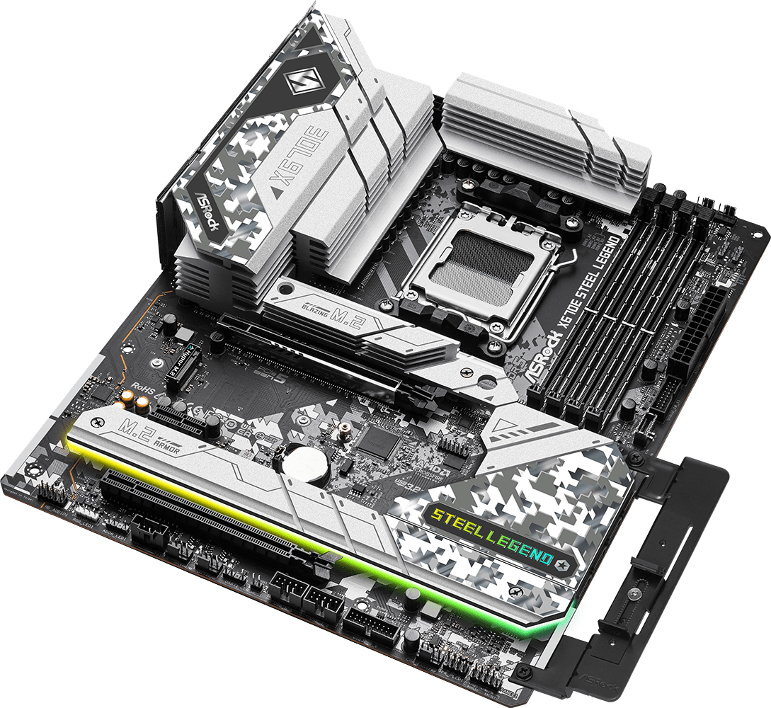 Asrock X670E Steel Legend. Fabricante de procesador: AMD, Socket de procesador: Zócalo AM5, Procesador compatible: AMD Ryzen 7 7th Gen. tipos de memoria compatibles: DDR5-SDRAM, Memoria interna máxima: 128 GB, Tipo de ranuras de memoria: DIMM. Interfaces de disco de almacenamiento soportados: M.2, SATA III, Tipos de unidades de almacenamiento admitidas: HDD & SSD, Niveles RAID: 0, 1, 10. Soporte para proceso paralelo: Crossfire. Tipo de interfaz ethernet: 2.5 Gigabit Ethernet, Gigabit Ethernet, Controlador LAN: Dragon RTL8125BG, Realtek RTL8111, Estándar Wi-Fi: Wi-Fi 6E (802.11ax)