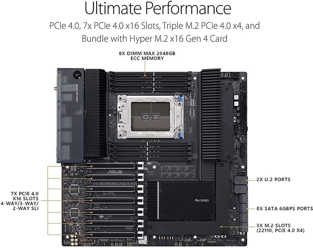 Zócalo AMD sWRX8: Compatible con los procesadores AMD Ryzen Threadripper de la serie PRO Conectividad: Puerto USB 3.2 Gen. 2x2 de tipo C, 10 puertos USB 3.2 Gen. 2, 3 M.2 PCIe 4.0, tarjeta HYPER M.2 x16 Gen. 4 y dos Ethernet Intel X550-AT2 de 10 Gb Administración remota ASMB9-iKVM: El chip BMC añade funciones de gestión fuera de banda y ofrece control hardware para optimizar los procesos de TI de tu arquitectura IPMI Rendimiento profesional: 16 etapas de potencia, soporte Multi-GPU y para memoria R-DIMM Estabilidad: Compatibilidad validada y equipada con SafeSlot para la óptima seguridad ? .Especificaciones: .- Marca ?ASUS.- Series ?Pro WS WRX80E-SAGE SE WIFI.- Fabricante ?Asus.- Peso del producto ?1 kg.- Toma del procesador ?AMD WRX80.- Dimensiones del producto ?33 x 30.98 x 10.4 cm; 1 kilogramos.- Tecnología de la memoria ?DDR4.- Número de modelo del producto ?90MB1590-M0EAY0.- Tipo de conexión inalámbrica ?802.11ax.- Interfaz de la tarjeta gráfica ?PCI-E