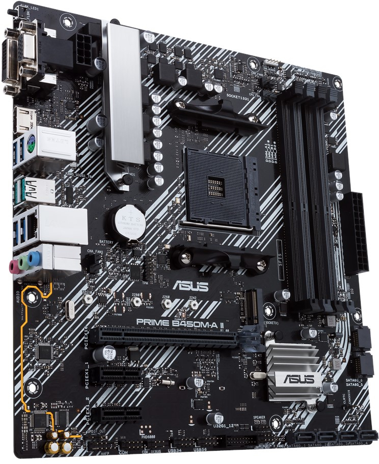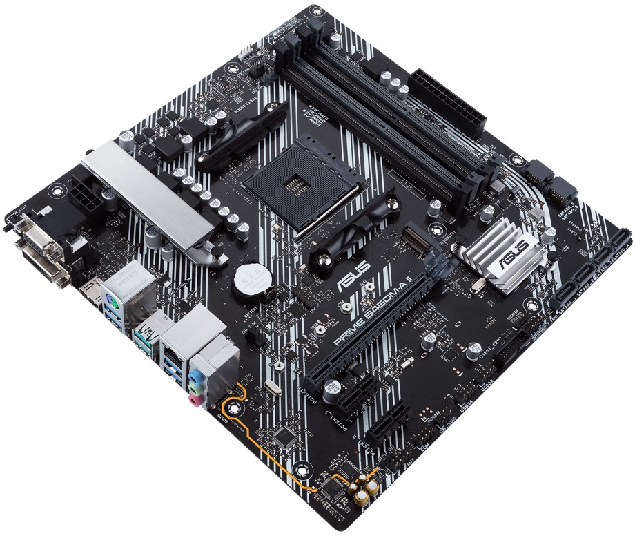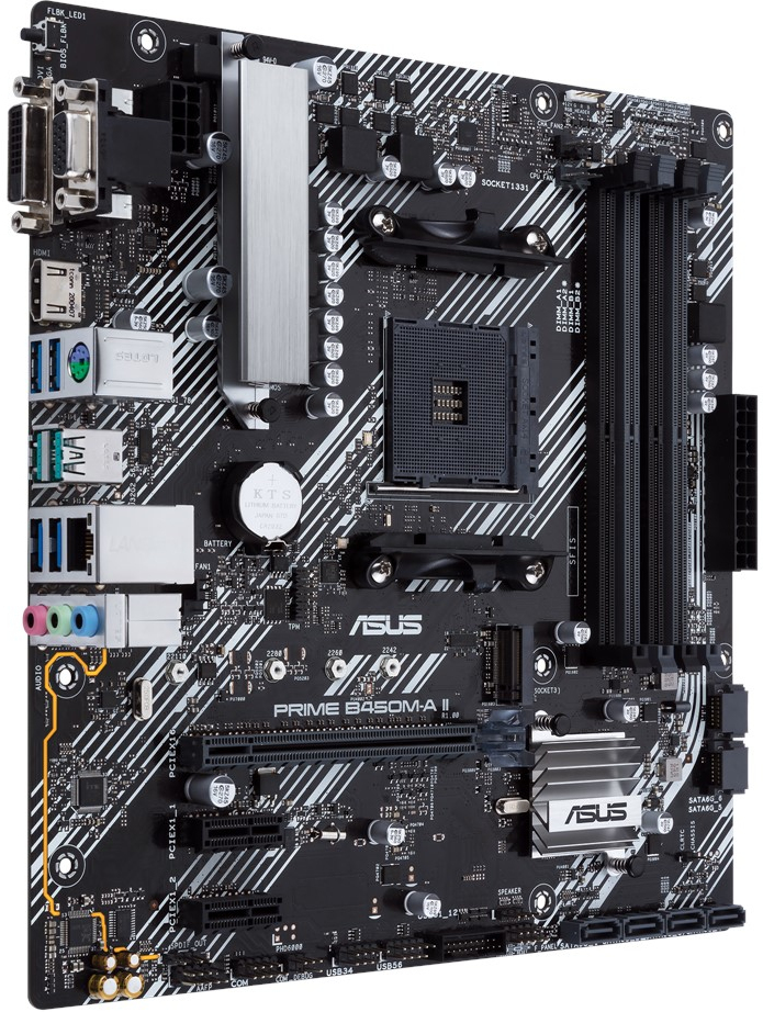 ASUS PRIME B450M-A II. Fabricante de procesador: AMD, Socket de procesador: Zócalo AM4, Procesador compatible: AMD Ryzen 3, AMD Ryzen 5, AMD Ryzen 7, 3rd Generation AMD Ryzen 9. tipos de memoria compatibles: DDR4-SDRAM, Memoria interna máxima: 128 GB, Tipo de ranuras de memoria: DIMM. Interfaces de disco de almacenamiento soportados: SATA III, Tipos de unidades de almacenamiento admitidas: HDD & SSD. Versión HDMI: 2.0b. Tipo de interfaz ethernet: Gigabit Ethernet, Controlador LAN: Realtek RTL8111H