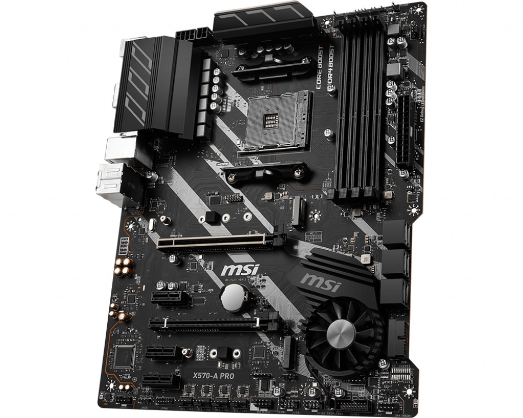 MSI X570-A PRO. Fabricante de procesador: AMD, Socket de procesador: Zócalo AM4, Procesador compatible: AMD Ryzen. tipos de memoria compatibles: DDR4-SDRAM, Tipo de ranuras de memoria: DIMM, Velocidades de reloj de memoria soportadas: 1866,2133,2400,2667,2800,2933,3000,3066,3200,3466,3600,3733,3866,4000,4133,4266,4400 MHz. Interfaces de disco de almacenamiento soportados: Serial ATA III. Soporte para proceso paralelo: 2-Way CrossFireX, Memoria máxima de adaptador de gráficos: 2048 MB, Máxima resolución: 4096 x 2160 Pixeles. Tipo de interfaz ethernet: Gigabit Ethernet, Controlador LAN: Realtek 8111H