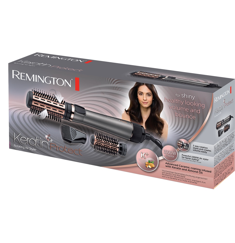 Remington AS8810. Tipo: Cepillo de aire caliente, Tecnología: Vapor. Color del producto: Plata, Negro, Oro. Longitud del cable: 3 m. Potencia: 1000 W, Fuente de energía: Corriente alterna. Diámetro del cepillo (mín.): 4 cm, Diámetro del cepillo (máx.): 5 cm