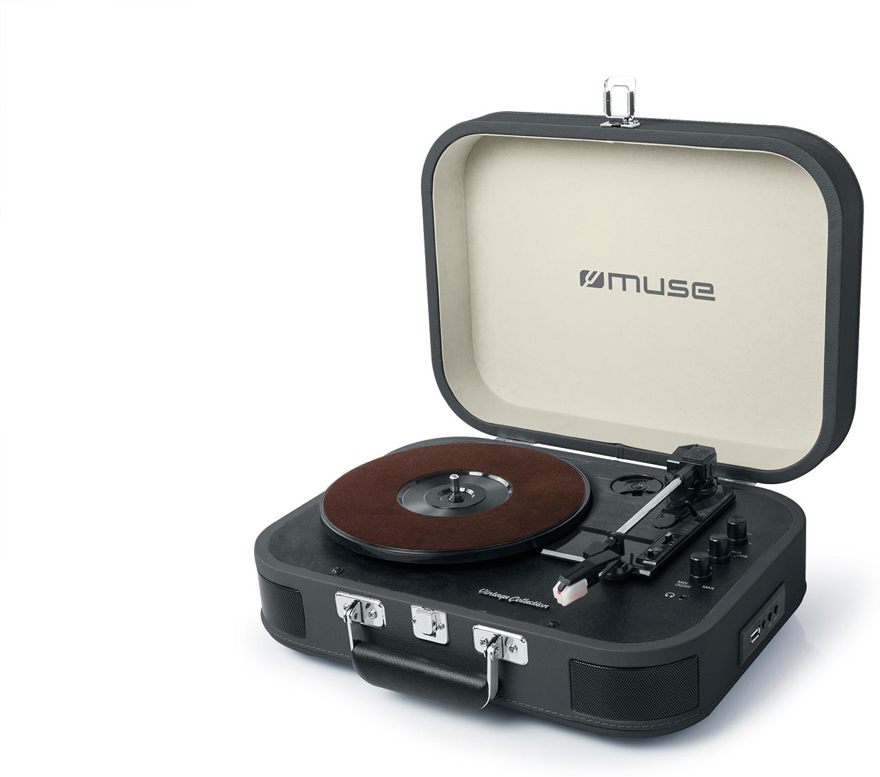 Muse MT-201 DG. Color del producto: Negro, Velocidad de tornamesa: 33,45,78 RPM. alcance Bluetooth: 10 m, Auriculares: 3,5 mm. Potencia estimada RMS: 5 W. Voltaje de entrada de adaptador AC: 100 - 240 V, Frecuencia de adaptador AC: 50/60 Hz. Ancho: 360 mm, Profundidad: 290 mm, Altura: 129 mm