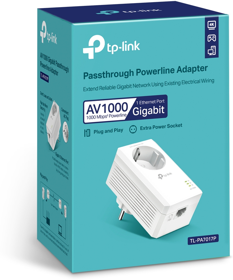 La red Gigabit va más allá\nAdaptador Powerline AV1000 Gigabit Passthrough\nTL-PA7017P\n\n1000 Mbps!\nPerfecto para actividades que requieren mucho ancho de banda\nCon la tecnología avanzada HomePlug AV2, TL-PA7017P proporciona a los usuarios tasas de transferencia de datos de alta velocidad de hasta 1000 Mbps, ideal para aplicaciones que requieren un uso intensivo de ancho de banda, como múltiples transmisiones de video HD/3D/4K, juegos en línea y transferencias de archivos grandes.\n\nPuerto Gigabit para\ntransferencia de datos ultrarrápida\nCon un puerto Gigabit Ethernet, TL-PA7017P permite a los usuarios conectar un dispositivo de ancho de banda intensivo a Internet a altas velocidades, lo que garantiza una transmisión fluida de videos Ultra HD. Esto hace que el TL-PA7017P sea el compañero perfecto de entretenimiento en el hogar.\n\nPlug and Play, no se requiere configuración\nConecte un adaptador de línea eléctrica al enrutador. Enchufe otro adaptador de línea eléctrica en un enchufe de pared en otra habitación. Conéctelo a su dispositivo habilitado para Internet a través de Ethernet, ¡y listo!\n\nToma de corriente adicional para dispositivos adicionales\n¿Le resulta difícil conectar sus dispositivos? El TL-PA7017P tiene una toma de corriente de paso de CA integrada. Su adaptador de línea eléctrica ahora se puede utilizar como una toma de corriente tradicional. Conecte su televisor inteligente o consolas de juegos al adaptador. No hay enchufe que desperdiciar\n\nEl filtro de ruido incorporado ayuda a evitar que el ruido de la señal eléctrica afecte el rendimiento de la línea eléctrica.\n\nHasta un 85% de energía ahorrada\nEl futuro se ve verde para los adaptadores de línea eléctrica. El diseño práctico y el sofisticado modo de ahorro de energía del TL-PA7017P, que cambia automáticamente de su modo normal de ""trabajo"" al modo de ""ahorro de energía"", reduce su consumo de energía hasta en un 85% .