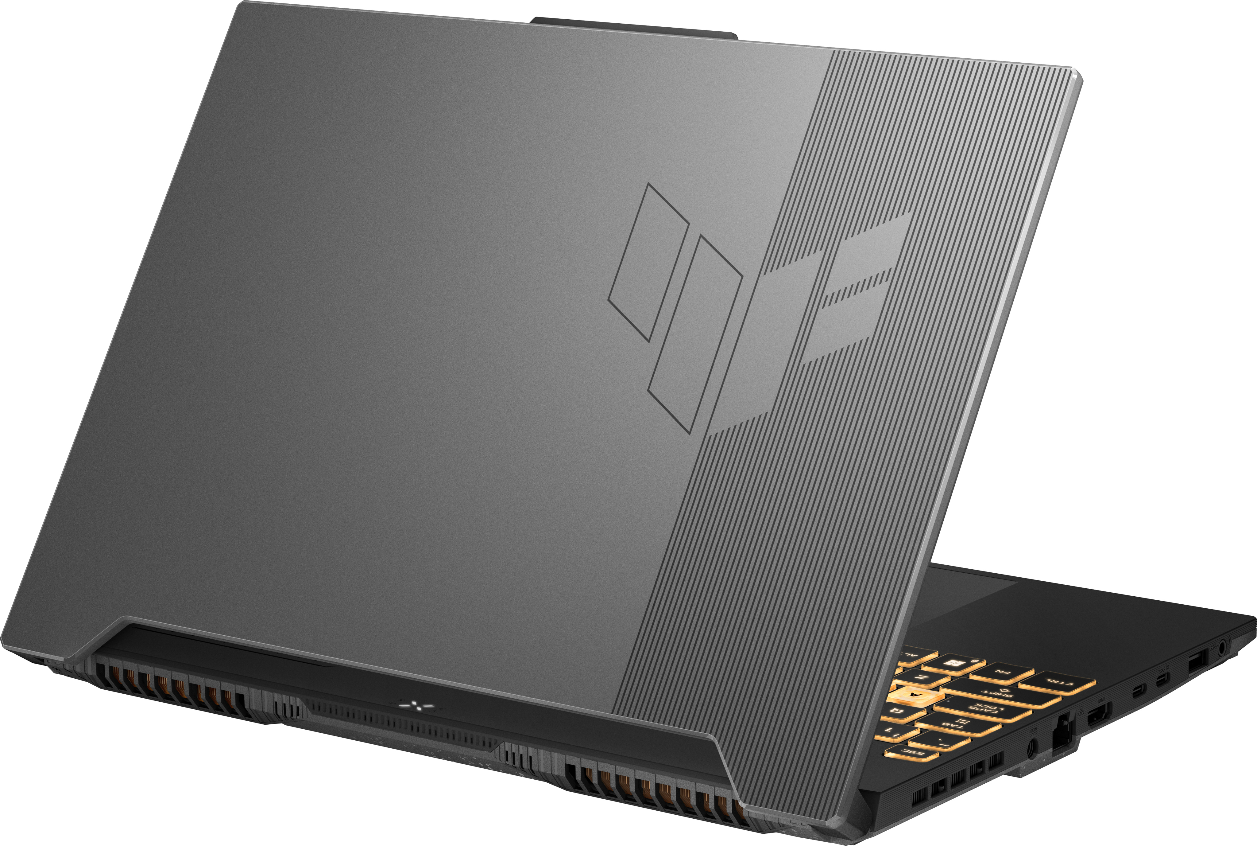 Resistencia optimizadapara el campo de batalla.\nEl nuevo chasis TUF Gaming de 2022 es un 4,5% más pequeño que los modelos del año pasado. El logotipo TUF se ha renovado con versiones en relieve y esculpidas con láser. A pesar de ser más pequeño, el nuevo TUF Gaming F15 2022 sigue albergando un gran touchpad con acentos inspirados en el anime y cuatro indicadores.\n\n