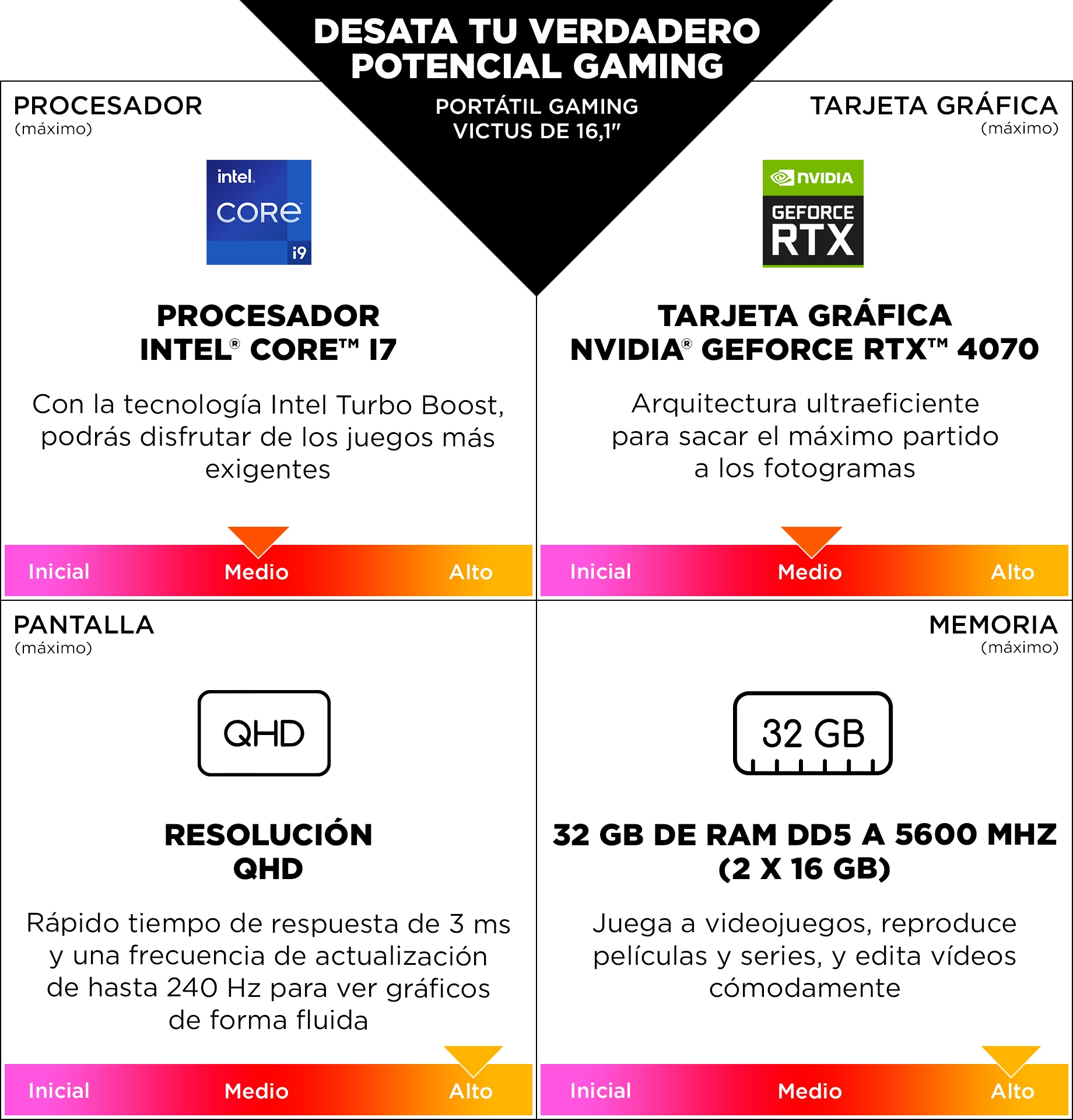 Disfruta del máximo rendimiento mientras juegas en cualquier lugar.\nEl portátil Victus by HP se ha diseñado para jugar en máxima calidad. Este elegante equipo cuenta con un procesador Intel® Core™ de 14.ª generación[1] y una moderna tarjeta gráfica NVIDIA®. Este portátil también dispone de nuevas funciones de optimización para impulsar aún más el rendimiento[2], una refrigeración mejorada y un teclado actualizado.