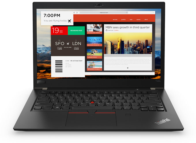 Potencia en movimiento\nLigero, fino y diseñado para rendir en cualquier lugar, el ThinkPad T480s te da lo que necesitas cuando lo necesitas. Sus potentes procesadores, su excepcional tarjeta gráfica y Dolby® Audio Premium™ llevan la eficiencia funcional a nuevos niveles. Además, las funciones de seguridad mejoradas te proporcionan la máxima seguridad estés donde estés.\n\nEl sueño de todo administrador de IT\nEl ThinkPad T480s viene de serie con un lector de huellas dactilares match-on-chip, tecnología antifalsificación que autentica las credenciales de inicio de sesión y ayuda a proteger tus datos, y ThinkShutter, un obturador de cámara web que puede abrirse y cerrarse. Este compacto y completo portátil de 35,56cm (14"") también lleva integrada una función LTE-A (opcional) global, que te permite estar conectado en todo el mundo, con o sin wifi.\n\nAdemás, cuenta con Microsoft AutoPilot para ahorrar tiempo en la configuración e implementación de cada T480s. Esta solución en la nube permite preconfigurar todos los portátiles para que estén listos para usar desde el primer momento. \n\nMejora el rendimiento y sorprende\nDiseñado para llevar tu productividad a nuevas cotas, el nuevo procesador Intel® Core™ i7 de 8.ª generación ofrece un mejor rendimiento que su predecesor y es mucho más rápido. Con la eficiencia y la velocidad mejoradas de la memoria DDR4 (hasta 24 GB), el T480s ofrece la potencia de un ordenador de sobremesa y la libertad de un portátil.\n\n¿No tienes enchufes cerca? No te preocupes.\nCon la batería totalmente cargada, el T480s ofrece **hasta 13,5 horas de autonomía. Cuando queda poca batería, la función de carga rápida ofrece un 80 % de capacidad en solo una hora. Así, puedes cargar la batería durante la hora de comer o mientras estás en una reunión para disponer de más de 12 horas de energía, más que suficiente para el resto del día.\n\nDiseño y utilidad\nInspirado por los clientes de ThinkPad, este último ThinkPad de la serie T tiene un conector de expansión USB-C en un lateral (en lugar de debajo), lo que permite que mida solo 18,45 mm de grosor y pese apenas 1,31 kg. También tiene un conjunto de puertos útiles, incluido el rapidísimo Intel® Thunderbolt™ 3. Además, si necesitas trabajar fuera de la oficina o en condiciones de poca luz, el renombrado teclado ergonómico ThinkPad cuenta con retroiluminación.\n\nSumérgete de lleno en la acción\nSi configuras tu T480s con una pantalla táctil opcional, podrás interactuar de forma más fácil e intuitiva con tu trabajo, además de divertirte más durante tu tiempo libre.\n\nPráctico y seguro\nGracias a Windows Hello, a un lector de huellas dactilares táctil y a una cámara de infrarrojos opcional, puedes ahorrar tiempo iniciando sesión solo el dedo o con una sonrisa. La cámara web de serie viene con ThinkShutter, una tapa que puede abrirse para usar la cámara y cerrarse al terminar.\n\nAvalado para superar cualquier dificultad y diseñado pa