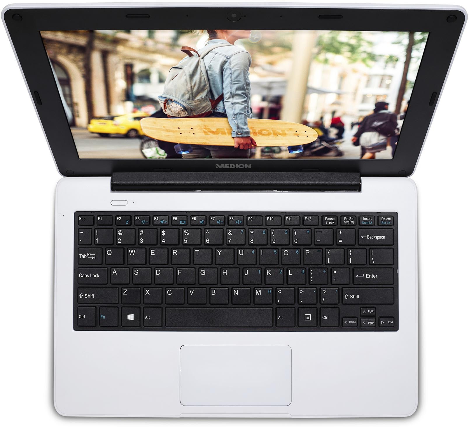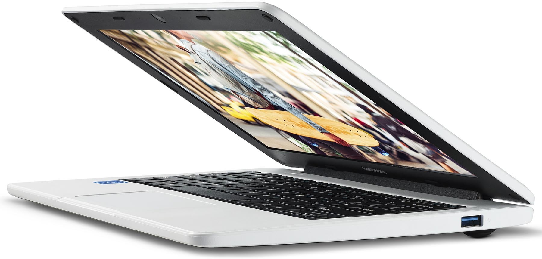 Ordenador portátil MEDION E11201 EDUCATION en color blanco, pantalla 11.6"" LCD HD, 1366 x 768 píxeles, sistema operativo Windows 10 Pro Education, procesador Intel Celeron N3450 1.1GHz a 2.2GHz, unidad eMMC de 64GB, 4GB de RAM, webcam 1MP, WiFi, Bluetooth, HDMI, audio, microSD, USB y USB-C, batería integrada de 5.000mAh.