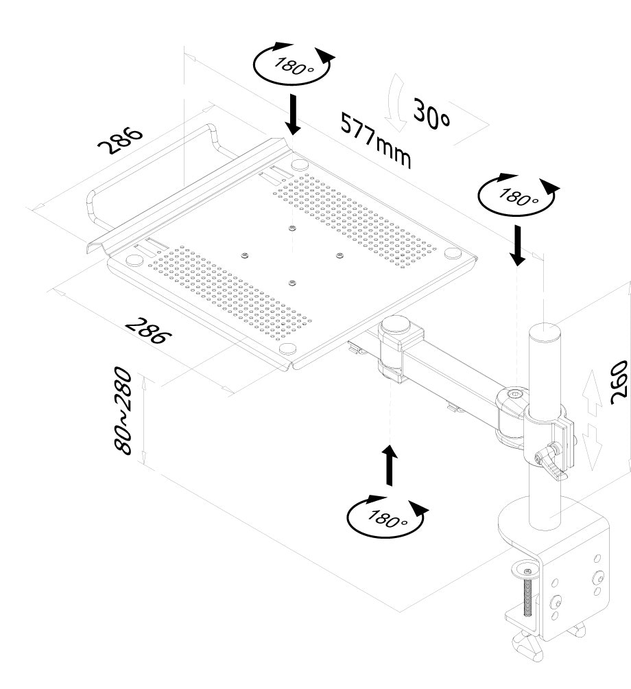 Con este soporte de mesa portátil NewStar puede montar el ordenador portátil a un escritorio. Este producto le permite girar el portátil a cualquier posición requerida.\n\nEl brazo también puede ser montado en la pared. Ajuste de la profundidad: 0-57 cm. Altura 0-26 cm.\n\nEste producto incluye un soporte de teclado.