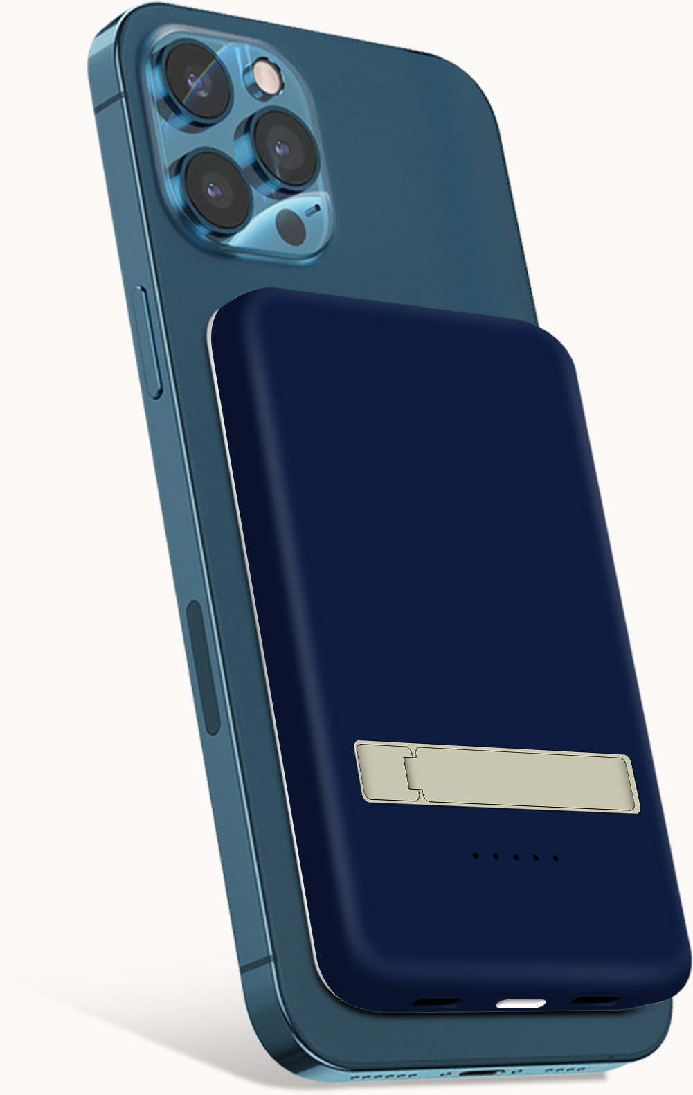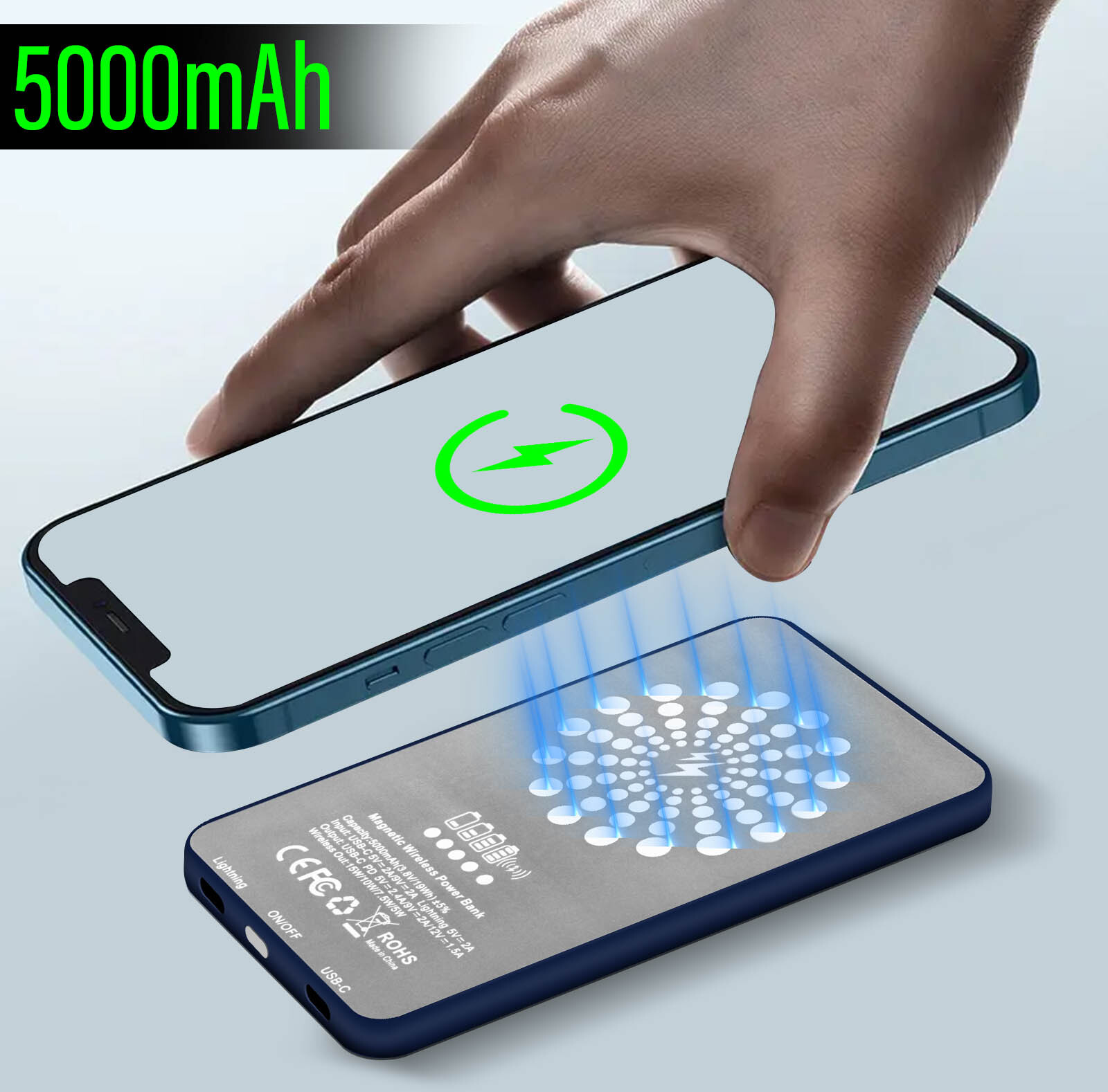 Powerbank MagSafe inalámbrica para cargar tu iPhone. Capacidad 5000mAH. Potencia máxima de hasta 15W. Salida USB-C de 2.4A para carga simultánea. Soporte plegable. Adhesivo incluido. Compacta (110 x 65 x 12mm). LED integrada.