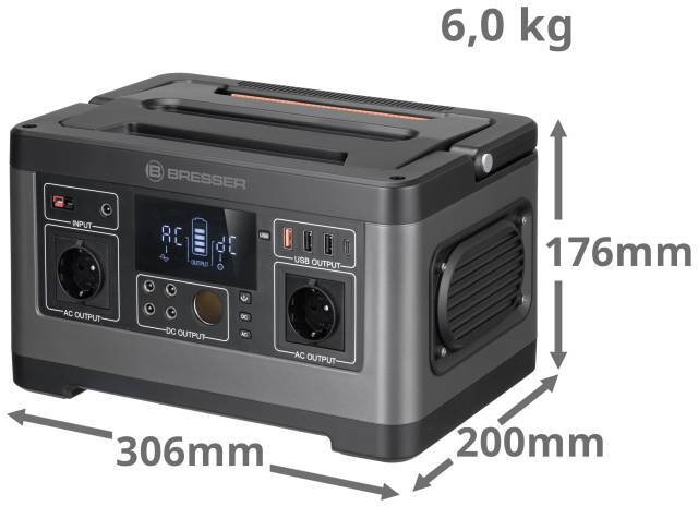 La estación de energía móvil de 500 vatios de BRESSER le ofrece la energía que necesita en cada situación con las diversas opciones de conexión, puede operar y cargar casi todos los dispositivos electrónicos comunes a través del potente 520Wh batería de iones de litio. Perfecto para portátiles, instrumentos musicales y similares: gracias a la salida de alta calidad de 230 voltios y 500 vatios con onda sinusoidal pura, también puede suministrar energía a dispositivos sensibles. Además, esta fuente de alimentación portátil es una alternativa silenciosa y respetuosa con el medio ambiente. Con el controlador de carga solar incorporado, puede usar la energía del sol para cargar directamente su estación de energía en combinación con un panel solar (disponible opcionalmente). Puede cargar hasta 4 dispositivos móviles USB. Visualización del estado de carga de la batería y estado de conmutación de las salidas en la pantalla.