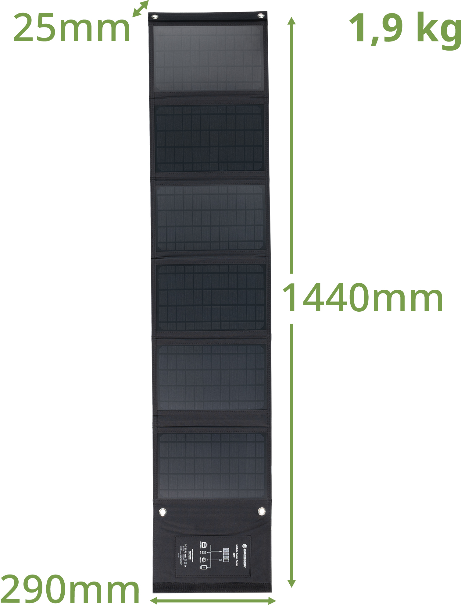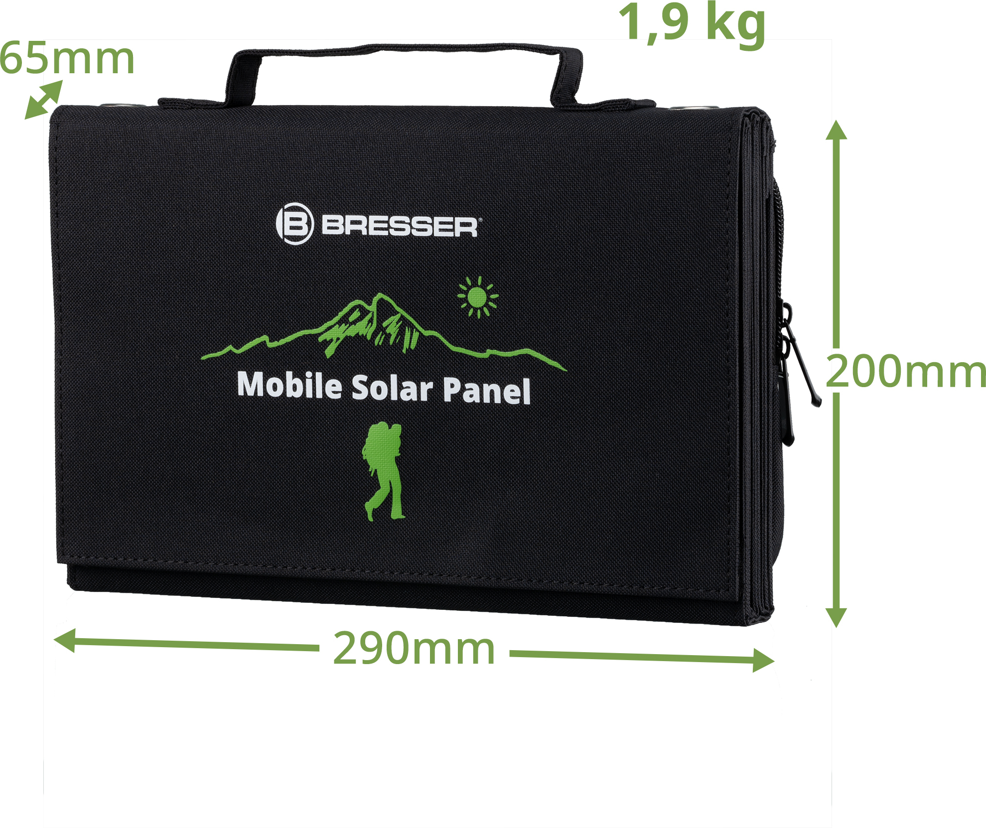 Panel solar ultracompacto para cargar smartphones, power banks, etc., rápido y eficaz gracias a las células solares monocristalinas de última generación y a la toma USB-A adicional con estándar QC3.0. .Viajes autosuficientes con el cargador solar BRESSER.Para los que disfrutan del aire libre durante largos periodos de tiempo y no quiere prescindir de su smartphone, tableta, powerbank, etc, se preguntarán¿dónde puedo encontrar la toma de corriente más cercana? Con el cargador solar ultracompacto BRESSER, sólo tiene que utilizar la energía del sol para cargar sus dispositivos. La energía solar, respetuosa con el medio ambiente, es gratuita y usted sigue siendo independiente de la red eléctrica..Simplemente ábralo, póngalo y produzca inmediatamente energía solar verde.El manejo es muy sencillo: despliegue el panel solar y alinéelo lo más perpendicularmente posible al sol. A continuación, conecte el dispositivo que desea cargar al cargador solar, ya sea con un cable USB adecuado (no incluido) o con el cable de conexión de CC incluido. El proceso de carga comienza inmediatamente..¿Qué dispositivos puede cargar el panel solar? todos los dispositivos con una conexión de alimentación USB o la conexión de enchufe de corriente continua vuelvan a funcionar en poco tiempo: por ejemplo, teléfonos inteligentes, tabletas, bancos de energía, playstations portátiles, reproductores MP4, dispositivos GPS y auriculares Bluetooth. Para cargar grandes estaciones de energía, recomendamos los paneles solares BRESSER más potentes con al menos 60 vatios de potencia de salida - ver art. no. 3810050, 3810060, 3810070..Cargador universal con opciones de conexión flexibles.Para alimentar sus dispositivos, dispone de dos tomas USB A de color negro para la carga normal y otra toma USB A de color naranja con el estándar QC3.0 para la carga rápida de las nuevas generaciones de dispositivos. El volumen de suministro incluye un cable de conexión universal adicional con una clavija DC hueca de 5,5/2,1 mm de diámetro y 2,5 metros de longitud, así como 3 adaptadores de enchufe (3,5/1,35 mm, 5,5/2,5 mm, 8,0/5,5/0,8 mm). La polaridad de los conectores es la siguiente: Contacto interior = positivo (+), contacto exterior = negativo (-)..¿Cuánto tiempo tarda en cargarse una batería?.He aquí un breve cálculo: Divida la capacidad de la batería (mAh) por la corriente de carga del cargador (mA) y multiplíquela por un factor de 75. Esto le da el tiempo de carga aproximado en minutos que se necesita para cargar completamente la batería al 100% de la duración del sol..Ejemplo: Una batería con una capacidad de 3000mAh (3,0 Ah) y una corriente de carga a través de una conexión USB de 5 voltios de 3100mA (3,1 amperios). Entonces 3000 : 3100 x 75 = 73 minutos. Dividiendo el resultado entre 60 se obtiene el tiempo de carga en horas: 1,2 horas..Esto significa que un smartphone medio puede cargarse completamente en solo 1,2 horas con un panel solar de 40 vatios. .Ganchos de mosquetón para la fijación