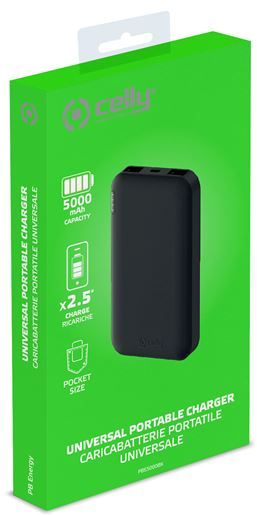 Celly PBE5000. Color del producto: Negro, Compatibilidad del cargador: Universal, Material de la carcasa: Plástico. Tecnología de batería: Ión de litio, Capacidad de batería: 5000 mAh, Fuente de carga: USB. Corriente de entrada: 2 A, Puerto actual 1 salida: 2,1 A, Puerto actual 2 Salida: 2,1 A. Interfaz de entrada: MicroUSB. Ancho: 65 mm, Profundidad: 15 mm, Altura: 100 mm