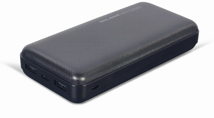 Gembird PB20-02. Capacidad de batería: 20000 mAh, Tecnología de batería: Polímero de litio, Voltaje de la pila: 3,7 V. USB A número de salidas: 2, Número de puertos USB Tipo C: 1. Potencia total de salida: 12 W, Corriente de salida: 2,4 A. Color del producto: Negro
