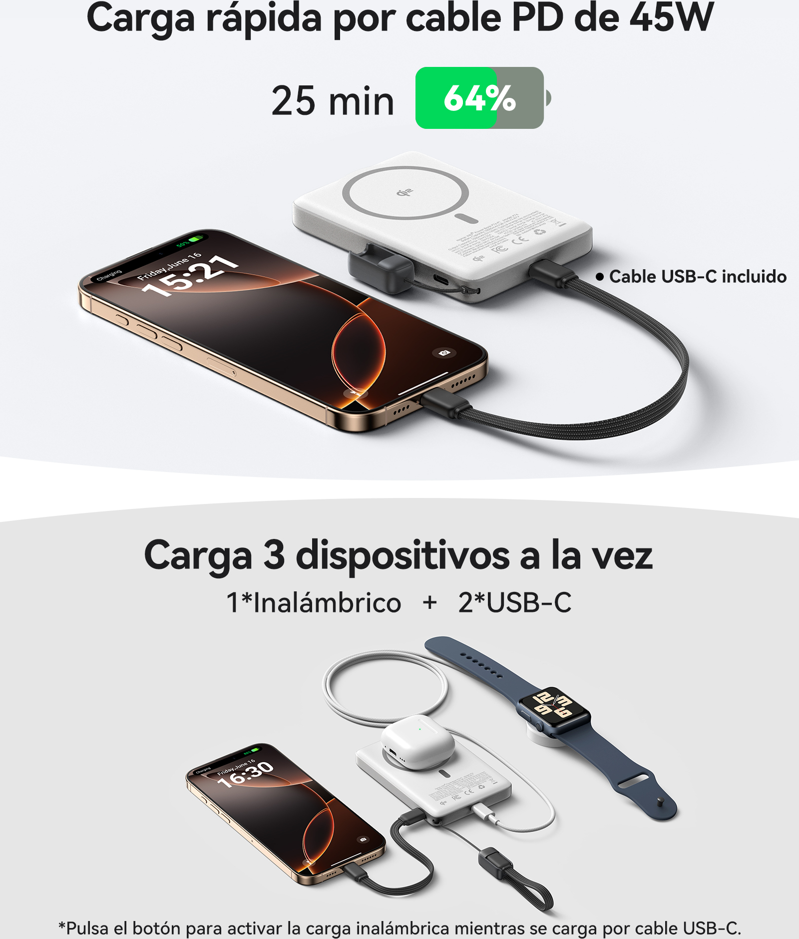 ¡Carga hasta 3 dispositivos a la vez!