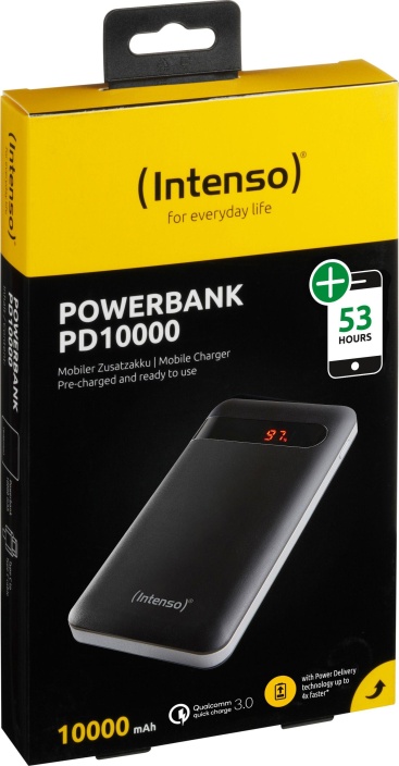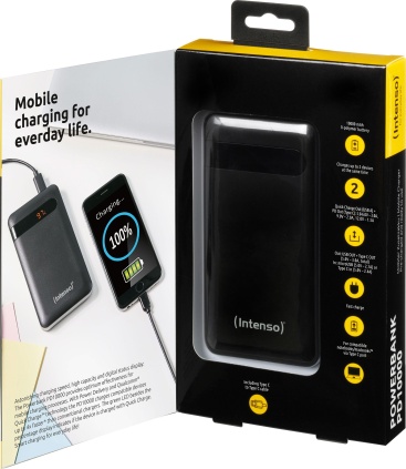 Intenso PD10000. Color del producto: Negro. Tecnología de batería: Polímero de litio, Capacidad de batería: 10000 mAh, Fuente de carga: USB. Tipos de puertos USB de entrada: Micro-USB + USB C