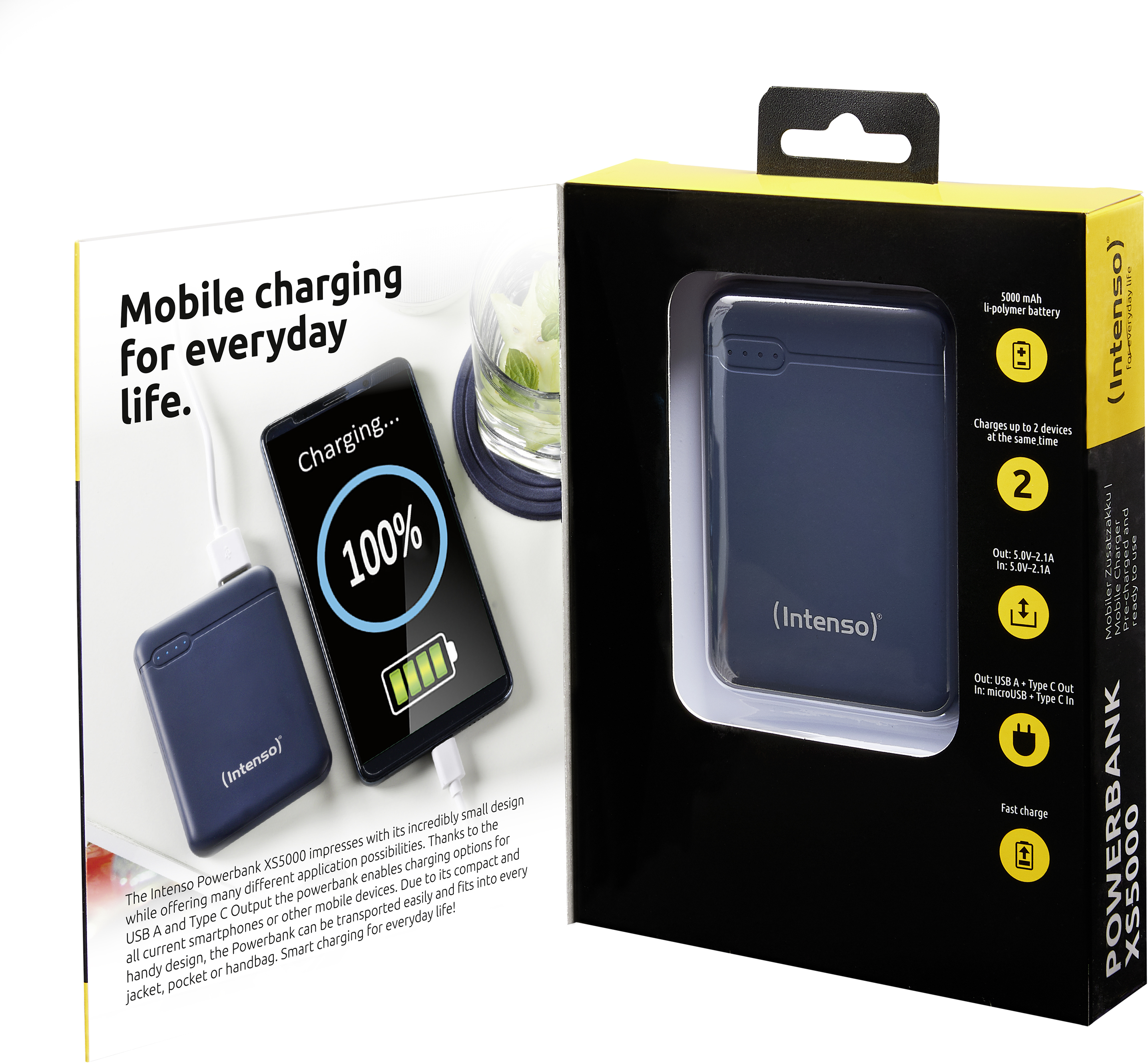 Intenso XS5000. Color del producto: Azul, Compatibilidad del cargador: Videocámara digital, Cámara digital, MP3/MP4, Teléfono móvil/smartphone, Tableta, Indicadores LED: Poder, Estado. Tecnología de batería: Polímero de litio, Capacidad de batería: 5000 mAh, Fuente de carga: USB. Voltaje de entrada: 5 V, Corriente de entrada: 2.1 A, Voltaje de salida: 5 V. Interfaz de entrada: Micro-USB + USB Type-C. Ancho: 90 mm, Profundidad: 63 mm, Altura: 12,6 mm